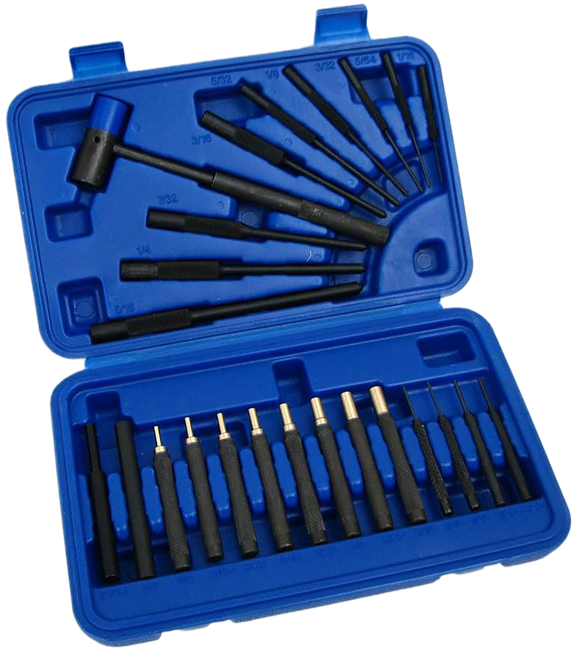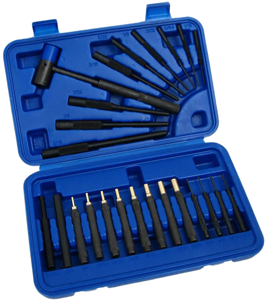 This universal 24 piece combination drive pin and roll punch set in a custom blow mold.The set is sure to compliment any work bench or range bag.Each set includes 6 brass tip drive pin punches (1/8", 9/64", 7/32", 1/4", 9/32", 5/16"), four steel tip drive tip punches (2 x 1/16" and 2 x 3/32"), two nylon drive punches (15/64", 3/8"), nine steel roll pin punches (5/16", 1/4", 7/32", 3/16", 5/32", 1/8", 3/32", 5/64", 1/16") and a reversible hammer with nylon and steel heads.