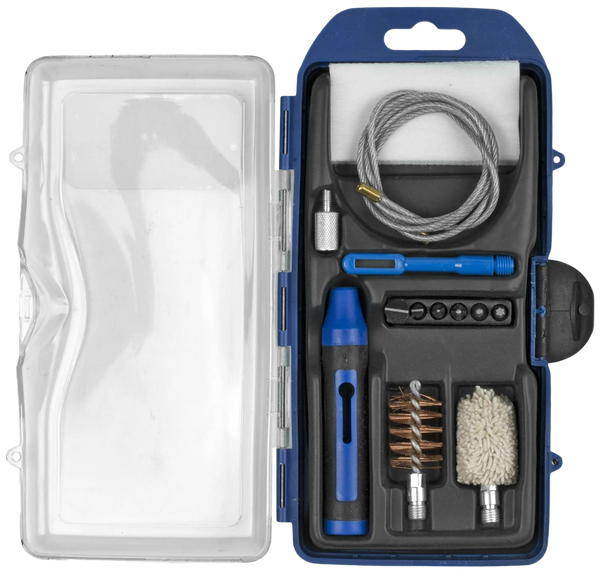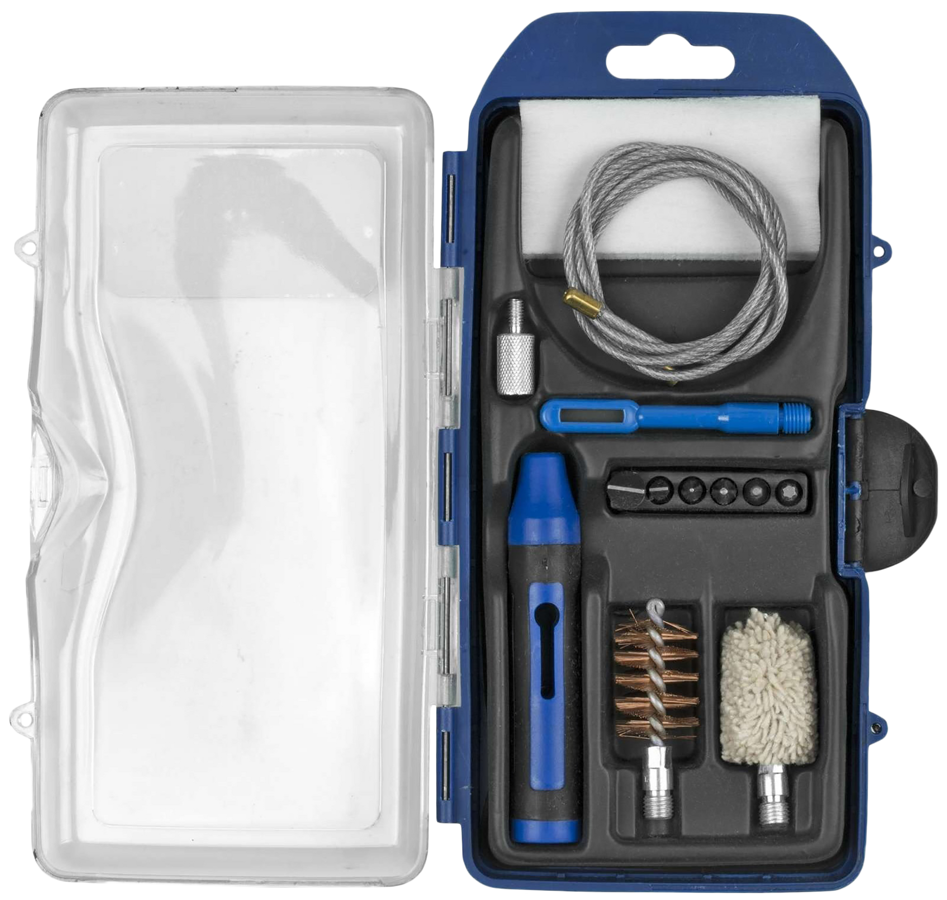 Multi-function handle can be used w/traditional rods, pull cords and also functions as a screwdriver handle, two piece solid brass rod, one phosphor bronze brush, one mop, one solid brass jag, one plastic slot tip, 25 cleaning patches, one set of 6 driver bits, custom molded tray in a clear top dual bond molded tpr locking case