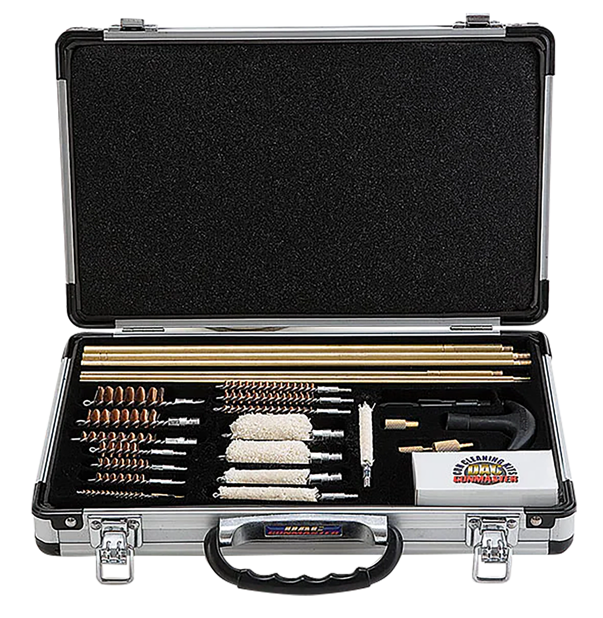 <p>the deluxe universal gun cleaning kit by dac technologies contains: two sets of three solid brass rods, one handle, 10 bore brushes (.17cal-.45cal and 410/20/12ga), 6 mops (.17cal,.22cal,.38/.357/9mm, 410, 20 and 12ga), two brass brush adaptors, one handle adaptor, two slot tips for patches, 6 jags, and 50 cleaning patches.</p>Caliber Or Gauge: Multi-CaliberType: Cleaning KitSize: 1 KitPieces: 35Bristle Type: Bronze BoreIncludes: Aluminum CaseCase Material: AluminumBore...View more