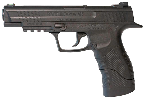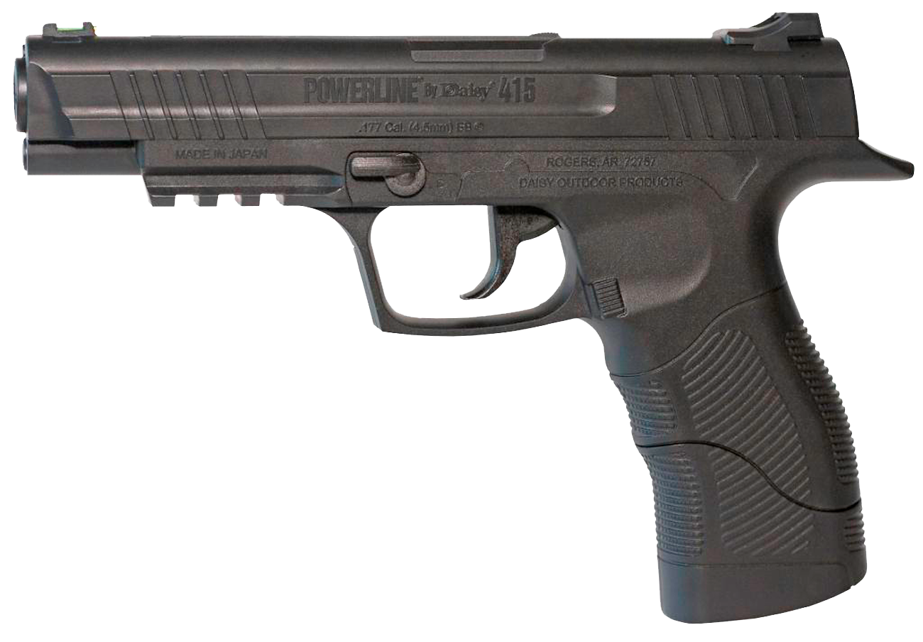 Daisy's powerline model 415 pistol is a 21-shot, semi-automatic, co2-powered bb repeater.Just load bbs into the built-in magazine, insert a co2 cartridge into the grip and you're ready for semi-automatic pistol shooting fun.Great for learning the techniques of gripping and shooting a firearm pistol - without the recoil and report.Open rear sight with fiber optic front sight and manual trigger block safety.With a maximum velocity of 495 feet per second, this pistol is recommended for adults and those 16 and older with adult supervision.