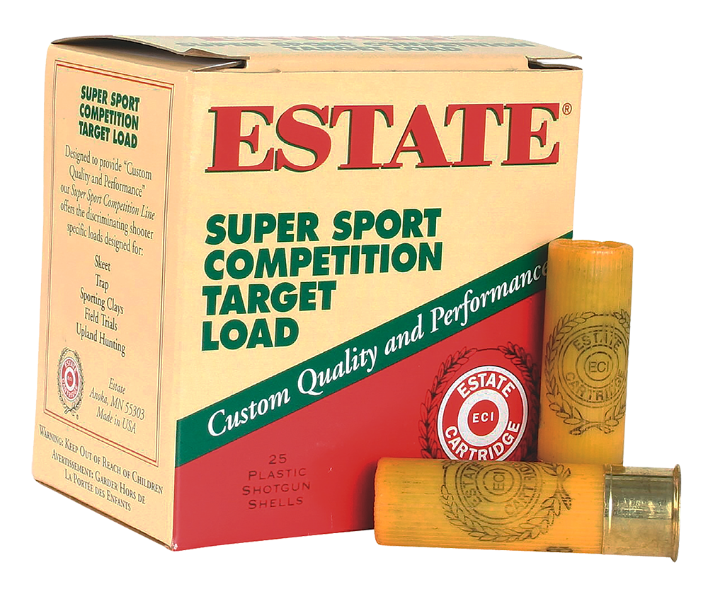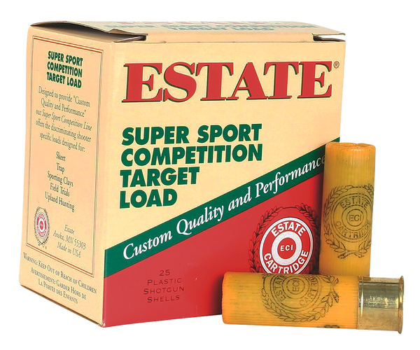 Estate's super sport competition target loads include fine progressive burning powder, specially designed perforated wads, magnum grade multi-screened shot and biaxially-oriented plastic hulls with a brass-plated metal head sensitive to uniform primers.