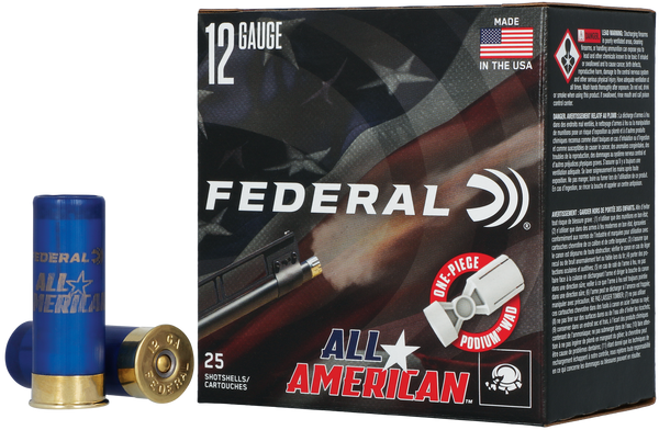 New federal all-american is engineered to win competition trap events with a podium wad that's customized for straight-wall hulls.The designs exclusive compression zone cushions the payload at ignition for softer shooting.High-antimony lead pellets strike the perfect balance of hardness and density, providing the energy needed to break distant clays while resisting deformation and maintaining pattern efficiency.Pushed by federals high-quality propellant and legendary primers, all-american crushes the toughest targets in high-level trap and skeet shooting.