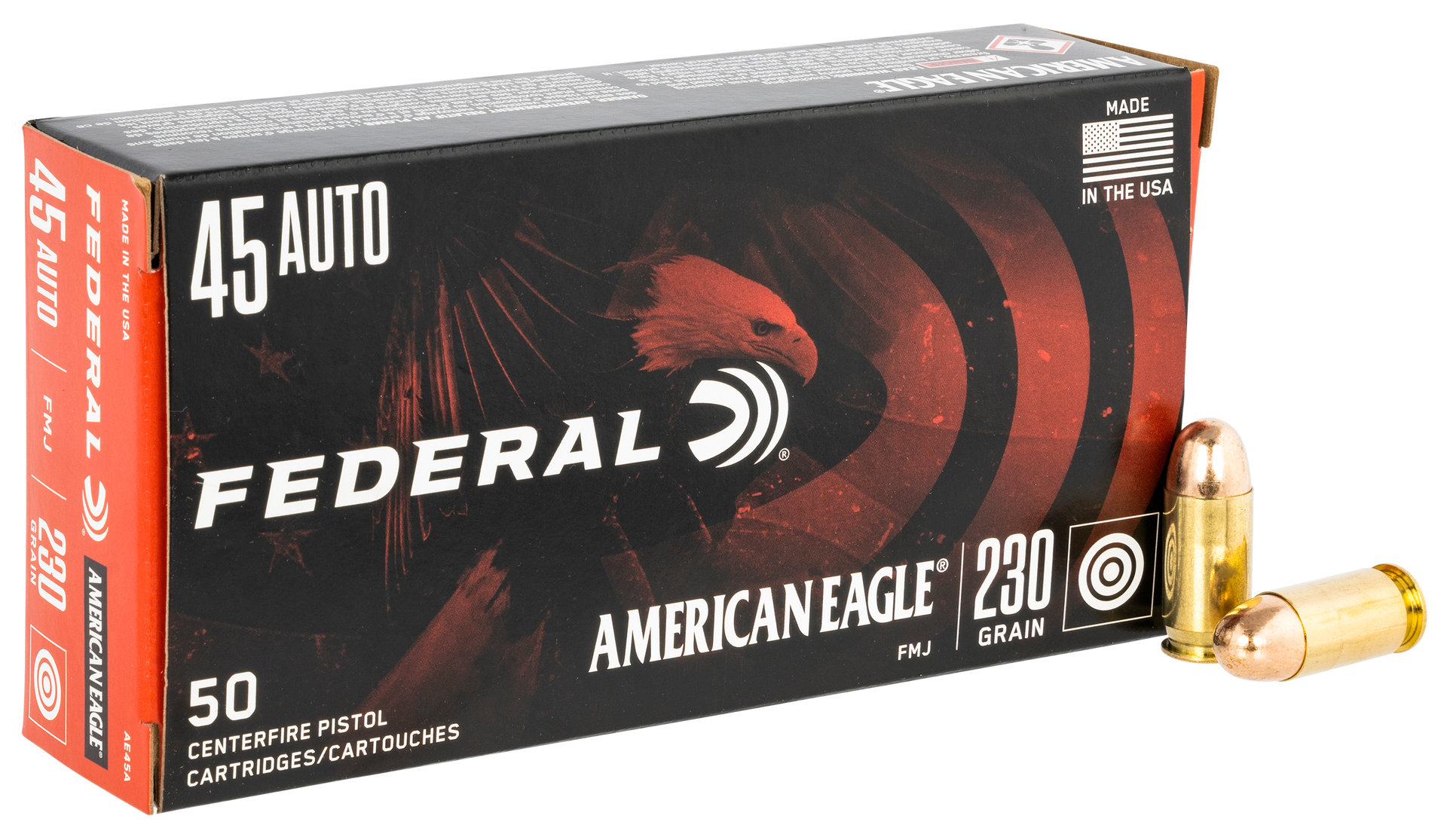 Hit the target and train harder with the proven line of american eagle handgun ammunition.It provides performance similar to self-defense and competition loads for a familiar feel and realistic practice.Caliber: 45 ACPBullet Type: Full Metal JacketBullet Weight: 230 grMuzzle Energy: 404 ft lbsMuzzle Velocity: 890 fpsRounds Per Box: 50Boxes Per Case: 20Application: Target ShootingCasing Material: BrassHazair: YesView more