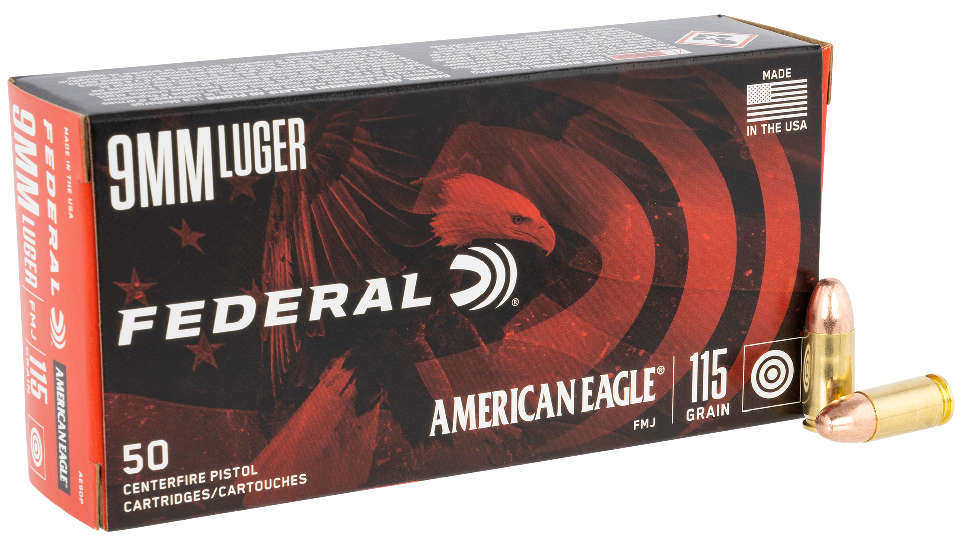 Hit the target and train harder with the proven line of american eagle handgun ammunition.It provides performance similar to self-defense and competition loads for a familiar feel and realistic practice.Caliber: 9mm LugerBullet Type: Full Metal JacketBullet Weight: 115 grMuzzle Energy: 356 ft lbsMuzzle Velocity: 1180 fpsRounds Per Box: 50Boxes Per Case: 20Application: Target ShootingCasing Material: BrassHazair: YesView more