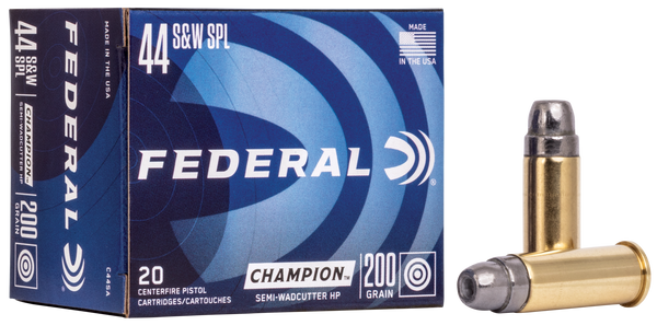 Federal champion handgun loads provide accurate, target-grade performance.They're loaded with federal brass and primers and are affordably prices for volume shooters.Caliber: 44 S&W SplBullet Type: Semi Wadcutter Hollow PointBullet Weight: 200 grMuzzle Energy: 336 ft lbsMuzzle Velocity: 870 fpsRounds Per Box: 20Boxes Per Case: 25Application: Target ShootingCasing Material: BrassHazair: YesView more