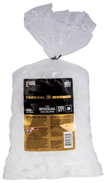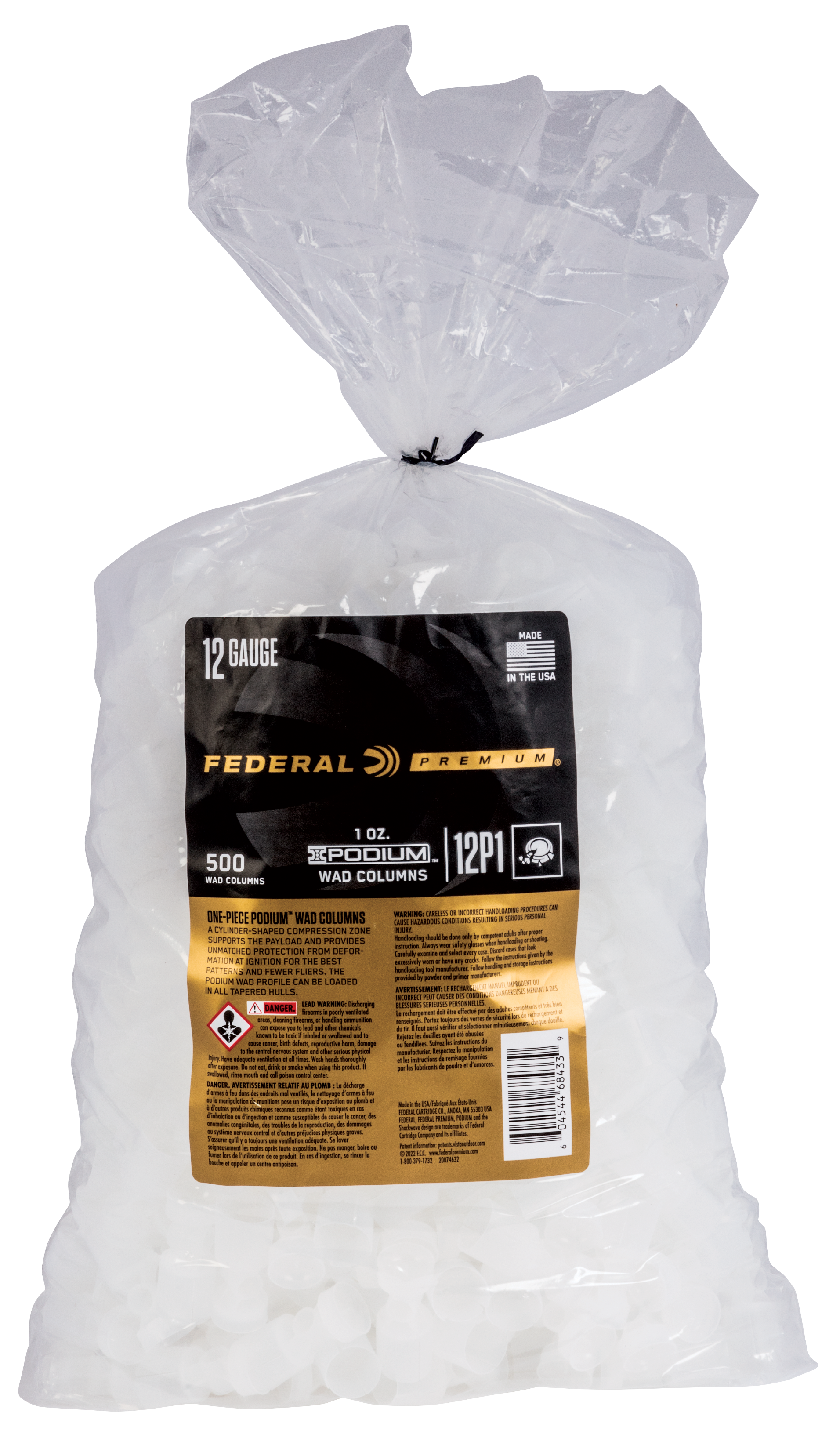 Podium wads drive peak performance in federal premium high over all competition target loads.The design's cylinder-shaped compression zone supports the payload and provides unmatched protection from deformation at ignition for the best patterns and fewer flyers.The soft-shooting wad's unique profile allows it to be loaded in all tapered hulls.