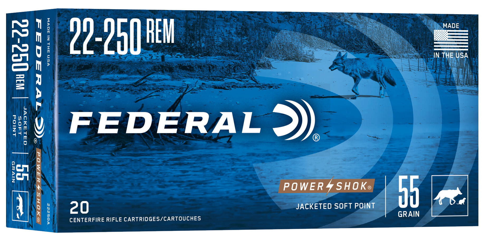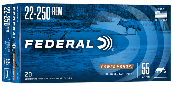 The traditional lead-core hunting bullets in federal power-shok rifle loads provide solid accuracy and power at an affordable price.They feature reliable federal brass, primers and powder and are suited to a wide variety of medium and big game.Caliber: 22-250 RemBullet Type: Jacketed Soft PointBullet Weight: 55 grMuzzle Energy: 1627 ft lbsMuzzle Velocity: 3650 fpsRounds Per Box: 20Boxes Per Case: 10Application: HuntingCasing Material: BrassHazair: YesView more