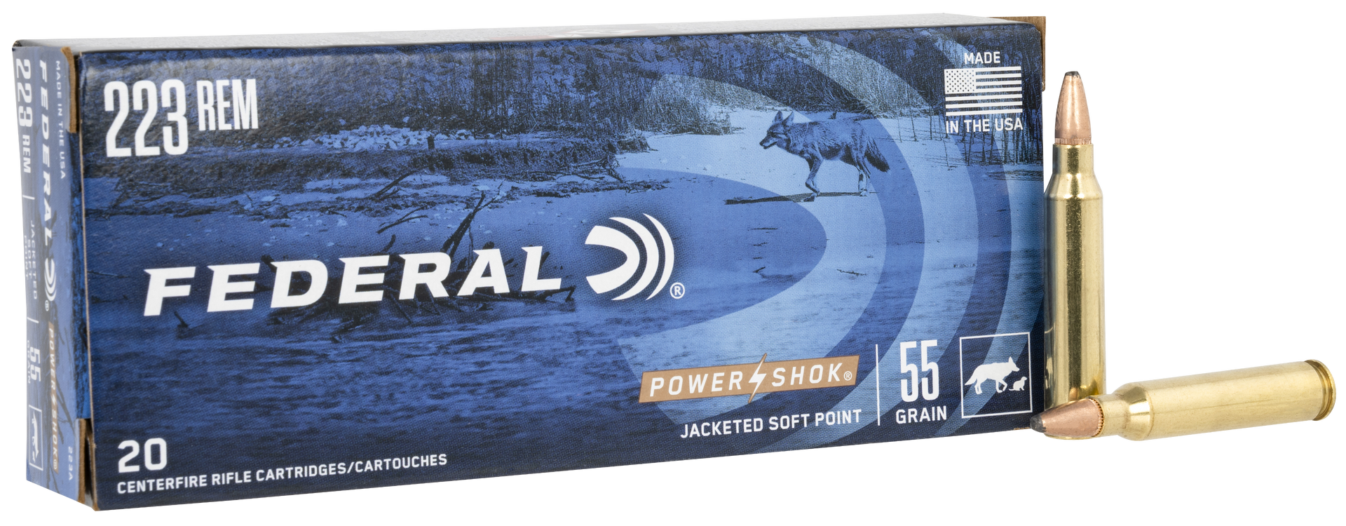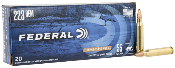 The traditional lead-core hunting bullets in federal power-shok rifle loads provide solid accuracy and power at an affordable price.They feature reliable federal brass, primers and powder and are suited to a wide variety of medium and big game.Caliber: 223 RemBullet Type: Jacketed Soft PointBullet Weight: 55 grMuzzle Energy: 1282 ft lbsMuzzle Velocity: 3240 fpsRounds Per Box: 20Boxes Per Case: 10Application: HuntingCasing Material: BrassHazair: YesView more