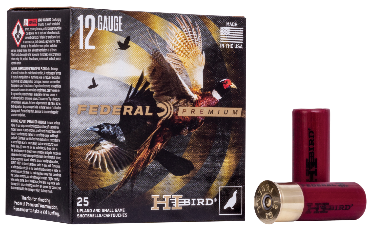 Hi-bird uses a two-piece wad with soft cell technology to decrease perceived recoil and produce more consistent long-range patterns.Plus, its lead shot is engineered for the optimum blend of hardness and density.Gauge: 12 GaugeType: LeadLength: 2.75"Ounces: 1 1/8 ozShot Size: 7.5Muzzle Velocity: 1275 fpsRounds Per Box: 25Boxes Per Case: 10Application: HuntingHazair: YesView more