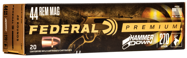 Velocities of federal premium hammer down loads are customized to produce superior ballistics and terminal performance through lever-action barrel lengths.The construction of the molecularly bonded soft point bullets has also been adjusted for the best accuracy and expansion at those velocities.The geometry of each rounds case, bullet and cartridge ensures flawless cycling through tubular magazine and typical lever-action feeding systems.