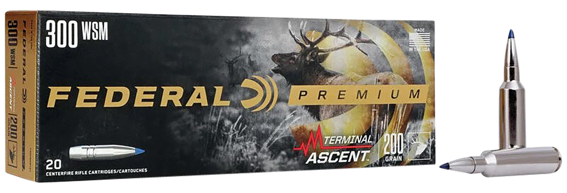 Federal premium terminal ascent bonded construction penetrates deep on close targets, while the patented slipstream polymer tip initiates expansion at velocities 200 fps lower than comparable designs.The bullets long, sleek profile offers an extremely high ballistic coefficient, and its accuchannel groove technology improves accuracy and minimizes drag.Caliber: 300 WSMBullet Type: Terminal AscentBullet Weight: 200 grMuzzle Energy: 3506 ft lbsMuzzle Velocity: 2810 fpsRounds Per Box: 20Boxes...View more