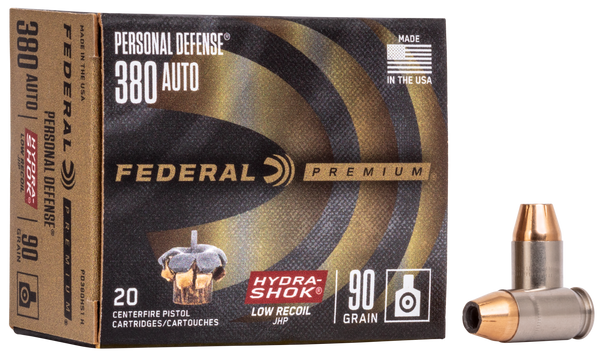 Hydra-shok remains one of the most popular choices among self-defense experts.Federal premium uses stringent manufacturing processes and rigorous testing to ensure hydra-shok loads perform accurately and consistently.Caliber: 380 ACPBullet Type: Hydra-Shok Jacketed Hollow PointBullet Weight: 90 grMuzzle Energy: 200 ft lbsMuzzle Velocity: 1000 fpsRounds Per Box: 20Boxes Per Case: 10Application: Home DefenseCasing Material: Nickel-Plated BrassHazair: YesView more