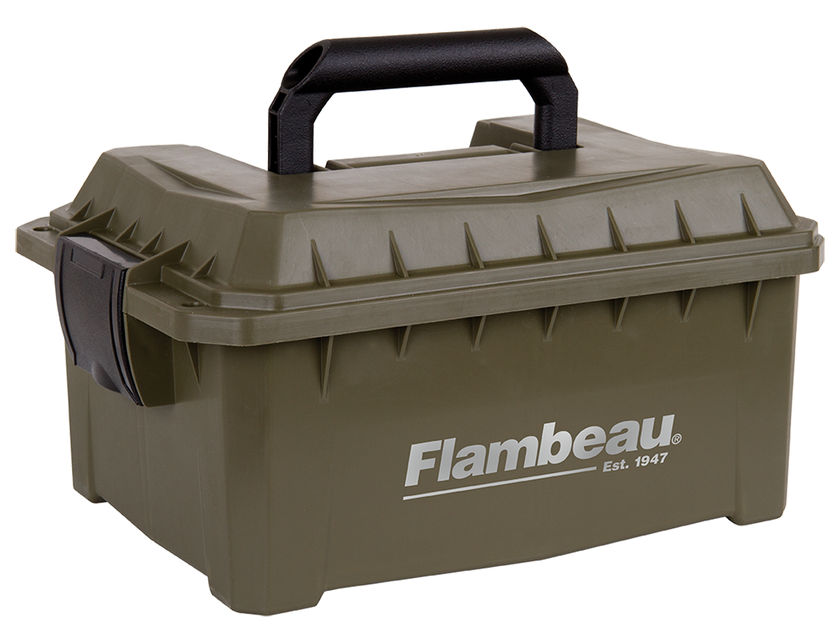 Flambeau's shotshell ammo can is a compact hard-sided storage solution that fits 3.5" shotshell boxes.It helps keep multiple loads organized, dry and ready for a day in the field, a morning in the blind, or an afternoon at the range.The can features a water-resistant gasket and is lockable.This model has a tan finish and interior dimensions of 9.625" l x 7.5" w x 4.25" d.It holds: four (4) 3.5"/3"/2.75" 12 gauge boxes; four (4) 3"/five (5) 2.75" 20 gauge boxes.