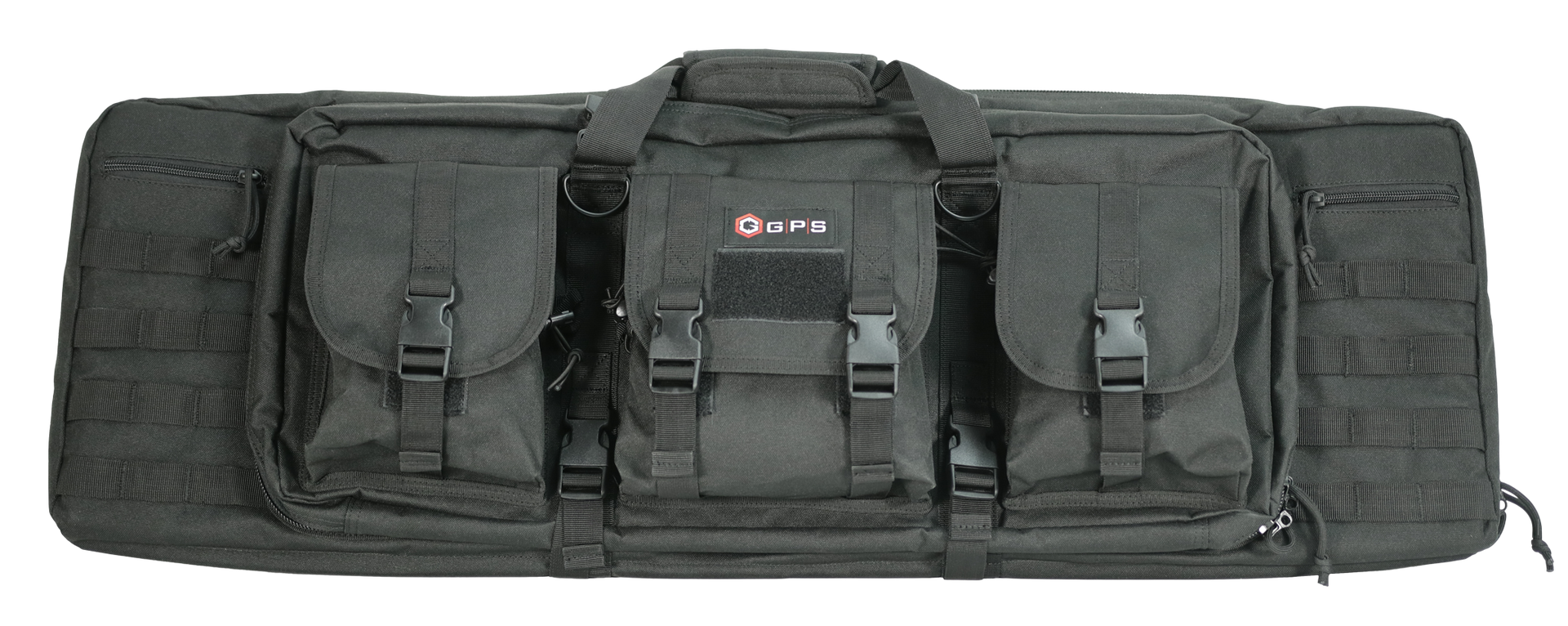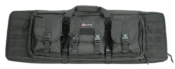 The double rifle case features a main padded double rifle slots with hook & loop lockdown straps and full length padded divider.It also has an external double pistol pocket with two large padded pistol sleeves and two zippered pockets.The case is constructed of 600d polyester with molle compatible webbing, woven cinch straps, side release buckles, and lockable zippers.
