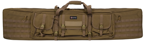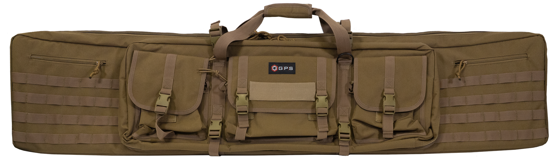 The double rifle case features a main padded double rifle slots with hook & loop lockdown straps and full length padded divider.It also has an external double pistol pocket with two large padded pistol sleeves and two zippered pockets.The case is constructed of 600d polyester with molle compatible webbing, woven cinch straps, side release buckles, and lockable zippers.The pistol pocket has external dimensions of 37" l x 11" h, while its internal pistol sleeve is 15" l x 10.50" h.Its middle pocket is 11.50" l x 8.50" h, side pocket 7.50" l x 8.50"h.