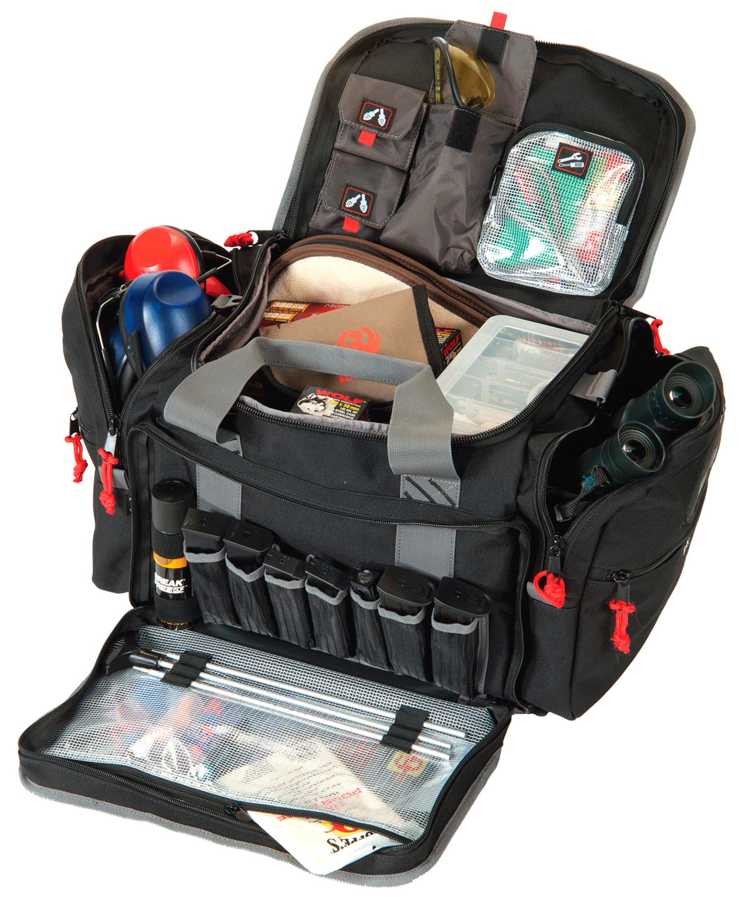 This magnum sized bag is designed to carry multiple handguns plus ammo for all.The long gun shooter will also appreciate the large u-shape top opening for ease of securing ammo.Both side pockets drop down for added protection for weapons and the backside drop pocket features a hook and loop backing for securing multiple ammo dump cups, for sorting bulk ammo or for saving brass casings...View more