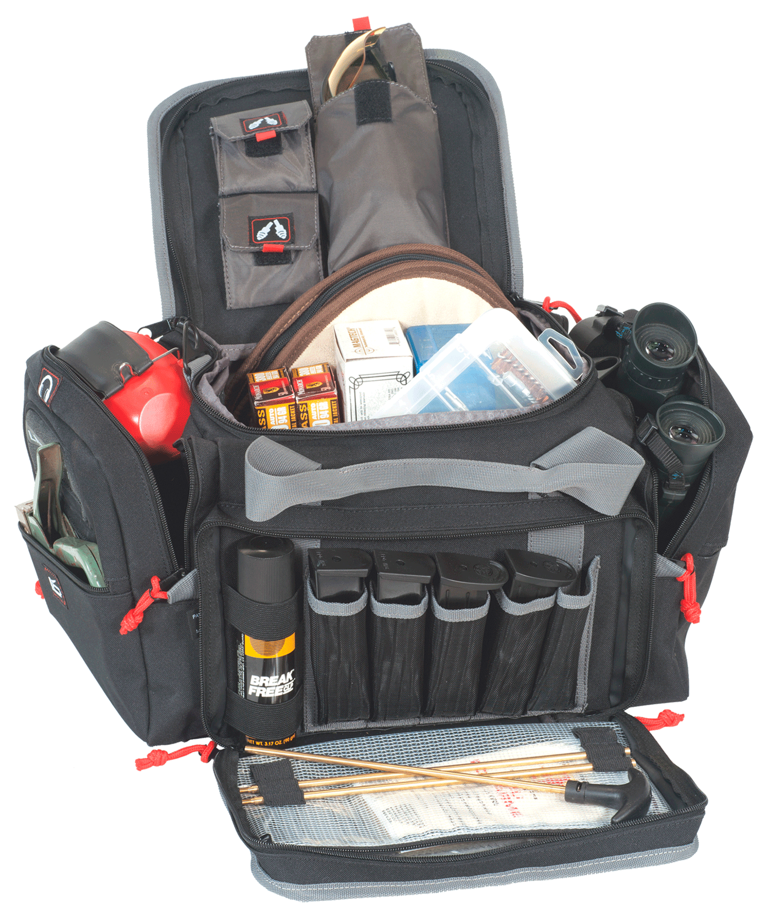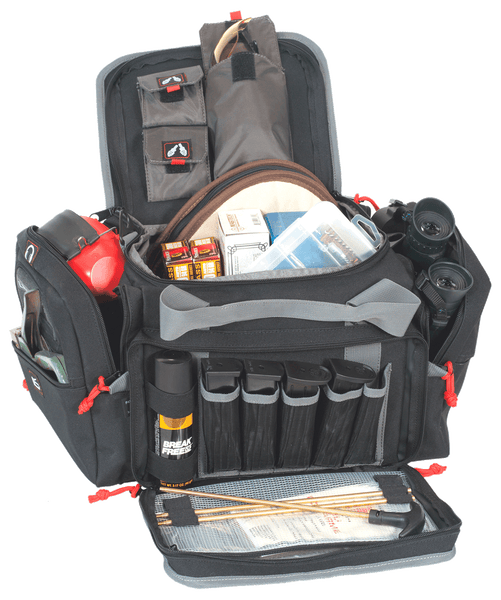 The medium range bag is perfect for the hand gun or long gun shooter.This bag has the visual i.D.Storage system that helps the shooter quickly access shooting glasses, ear plugs, ear muffs, binoculars, shooting targets, tools, ammo dump cups, stapler, tape or cleaning supplies.Lift ports are on each end of the bag for easy maneuvering with 2 hands.The bag features padded walls and bottom to...View more