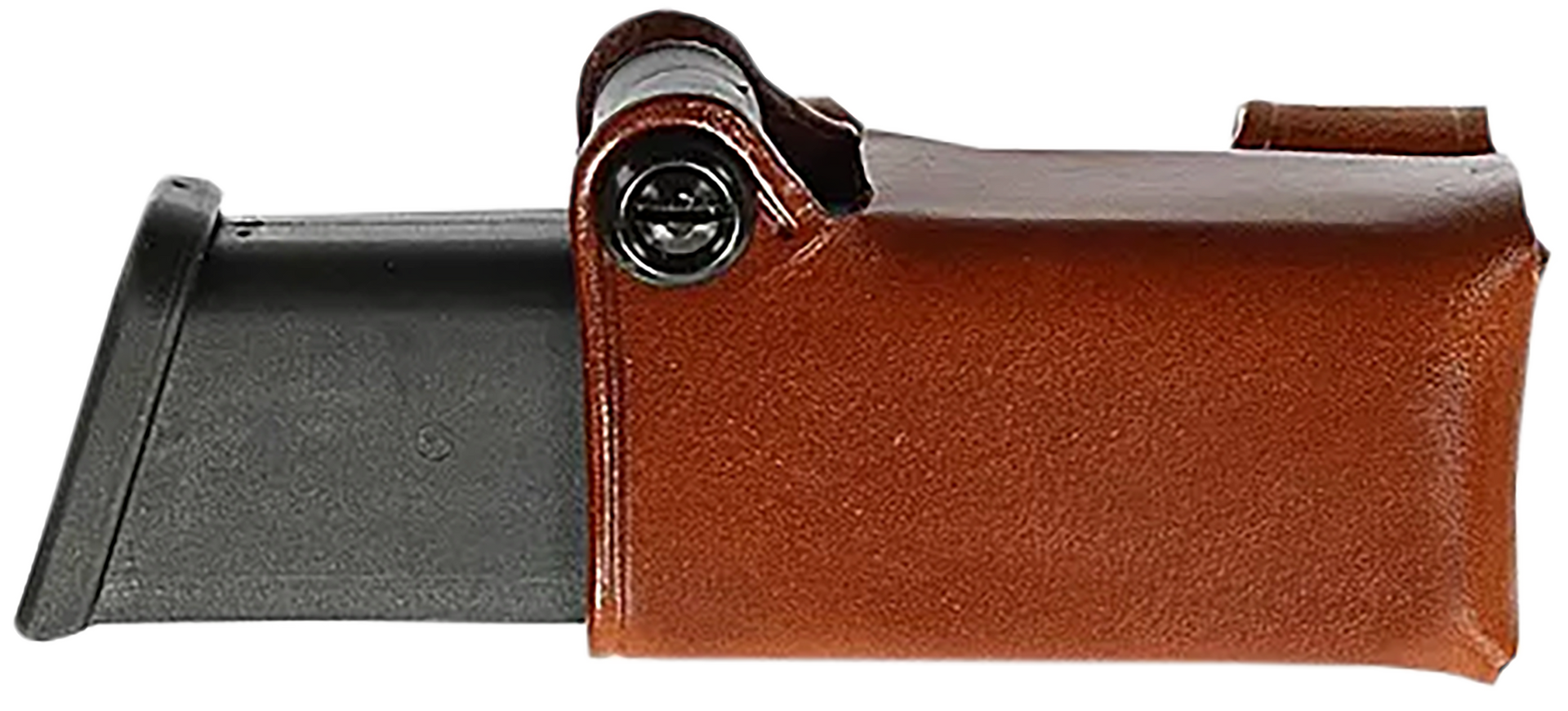 Providing an alternative to the traditional vertical magazine carrier, the horizontal magazine carrier holds a single spare magazine in a horizontal position.Two belt channels allow placement around a belt loop for added stability and security.The tension unit adjustment provides a custom fit and secure magazine carry.
