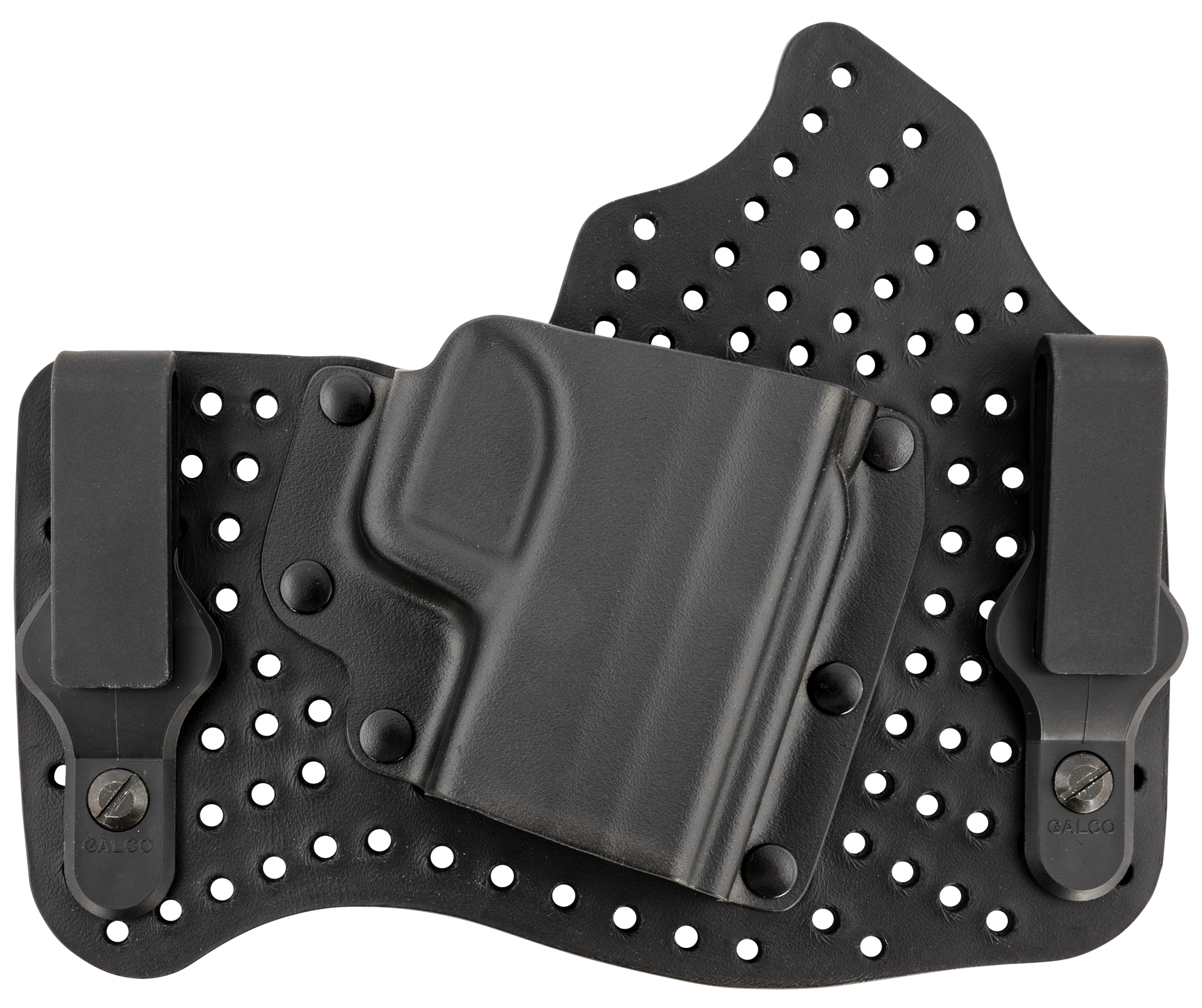 A cooler alternative to galco's best-selling kingtuk iwb, the patented kingtuk air provides a level of comfort previously unknown with broad-plated iwb holsters.The ventilated backing plate combined with a rigid kydex holster pocket provides extreme comfort along with fast draw and easy holstering.Its removable metal belt clips can be moved up or down in the corresponding holes in the leather, enabling the user to set the carry height and angle to suit their unique preferences.