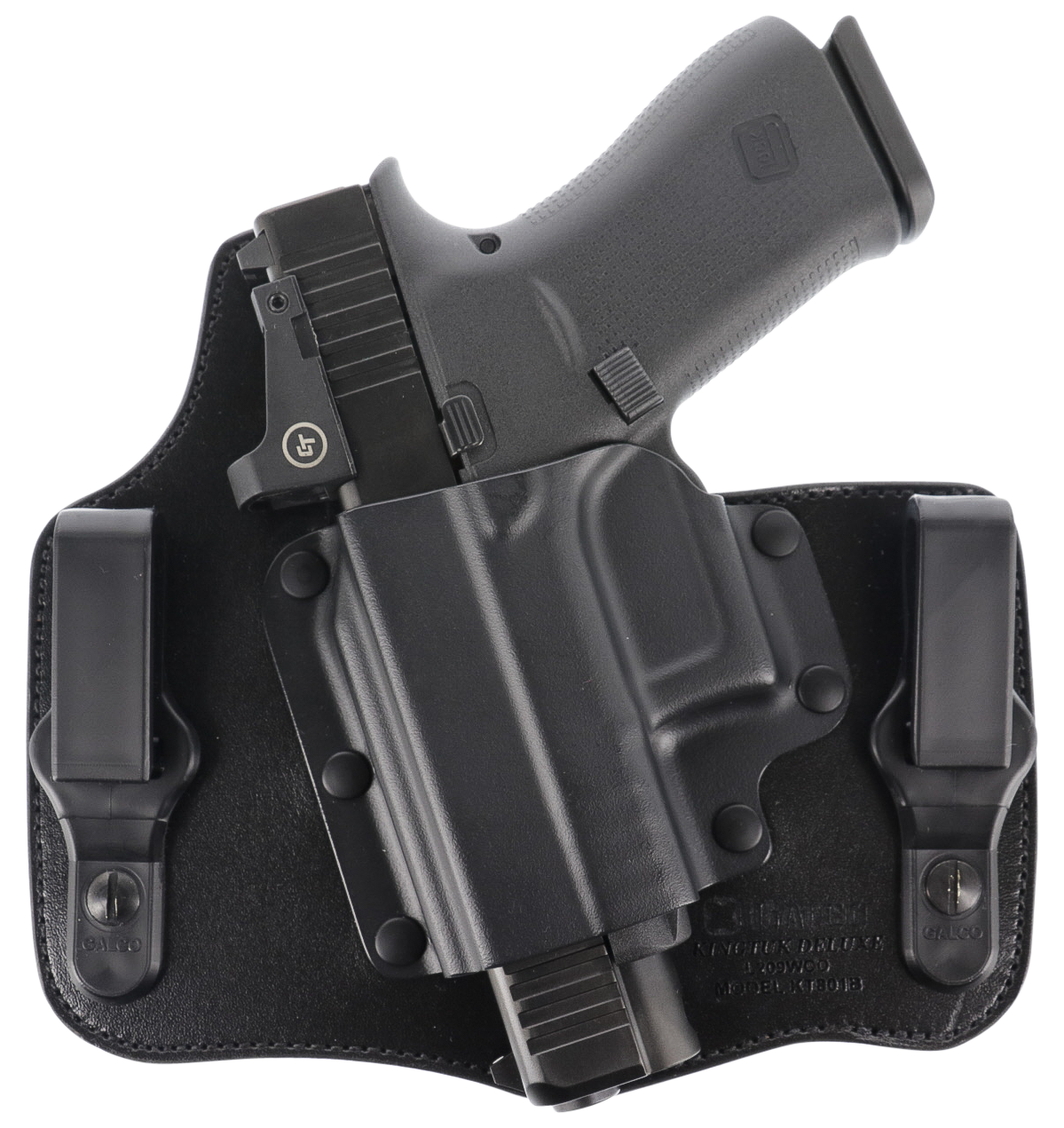 Galco's kingtuk deluxe tuckable iwb reigns supreme in comfort, speed and versatility.It provides a comfortable backing plate made of saddle leather and lined with premium center cut steerhide, with a rigid kydex holster pocket for a fast draw and easy holstering.It includes galco's patent-pending polymer uniclip and ultimate stealth clip designs for excellent concealment, stability and easy on-off capability.The clips can be moved up or down in the corresponding holes in the leather, enabling the user to set the carry height and angle to suit their unique preferences.Fits glock 43, 43 w/wo red dot, 43x, 43x mos, 43x w/wo red dot, 48, 48 mos, 48 w/wo red dot; springfield hellcat pro, hellcat pro w/wo red dot, hellcat rdp, hellcat w/wo red dot; taurus gx4.