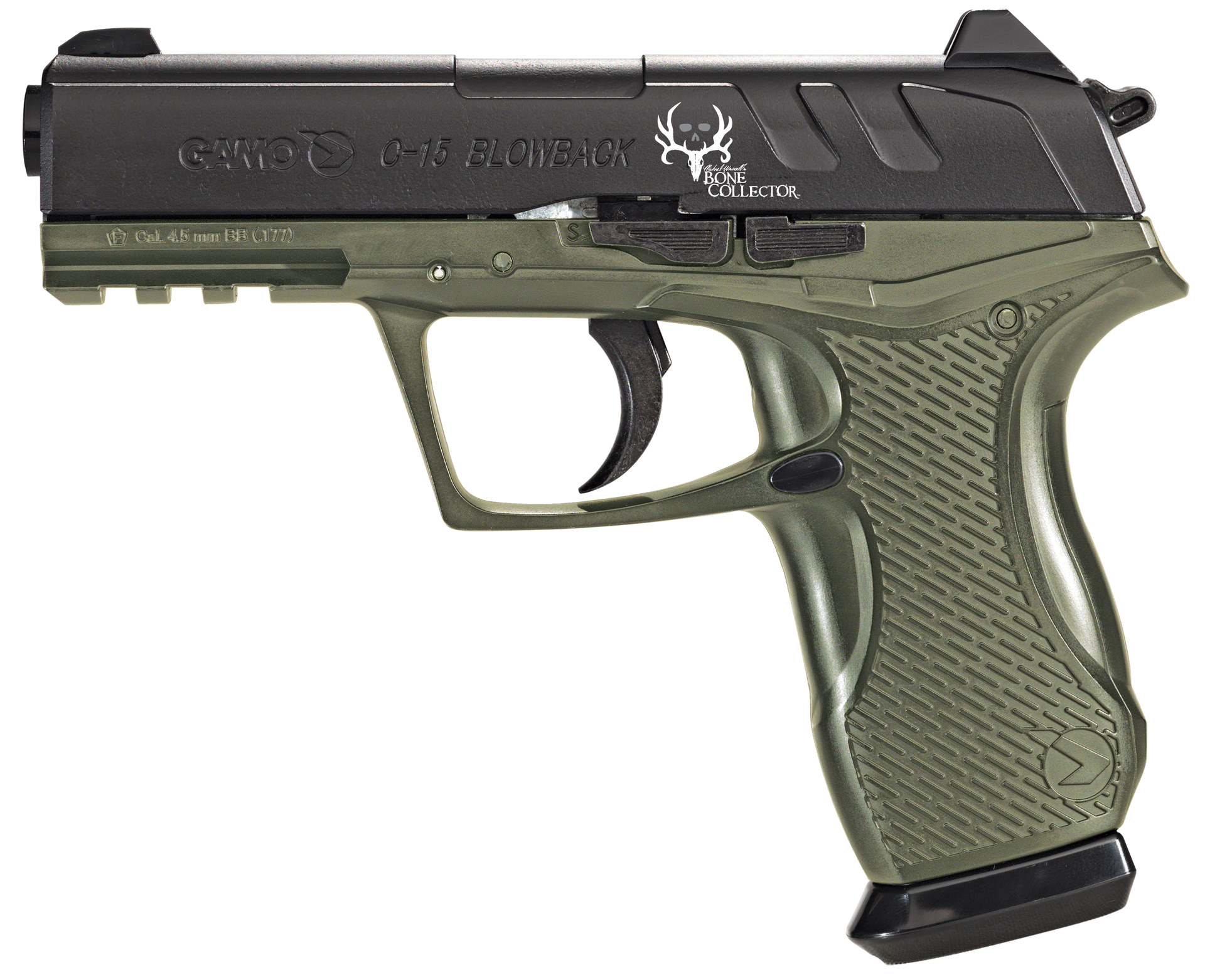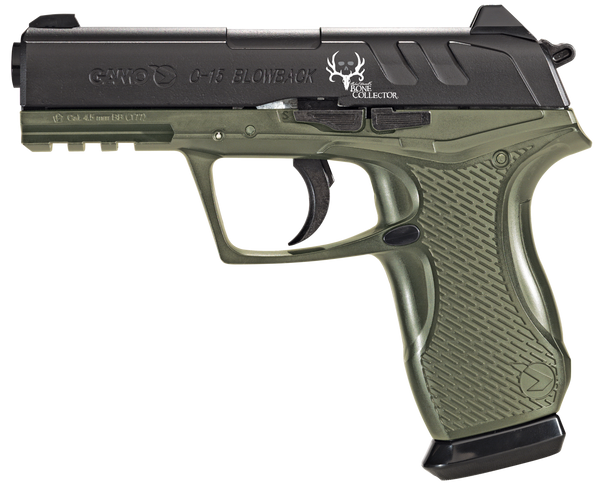 In order to enhance the authentic look and feel to an already proven design and recognized craftsmanship, gamo's c-15 blowback tactical series semi-automatic, co2 powered pellet pistols are equipped with a true blowback action.It is capable of up to 430 fps with pba ammo.This model features a tactical rail on the polymer frame and the bone collector logo on the slide.It comes with a 16 capacity (8x2) double rotary magazine allowing rapid shooting.