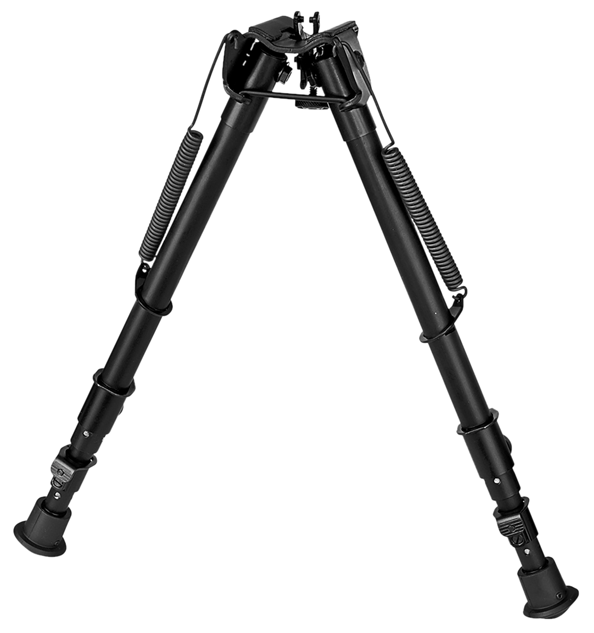 Harris bipods clamp to most q.D.Stud equipped bolt action rifles and have a sling attachment provision.Spring loaded folding legs are quickly adjustable for height.Manufactured with heat treated steel and hard alloys, bipods have a black anodized finish.