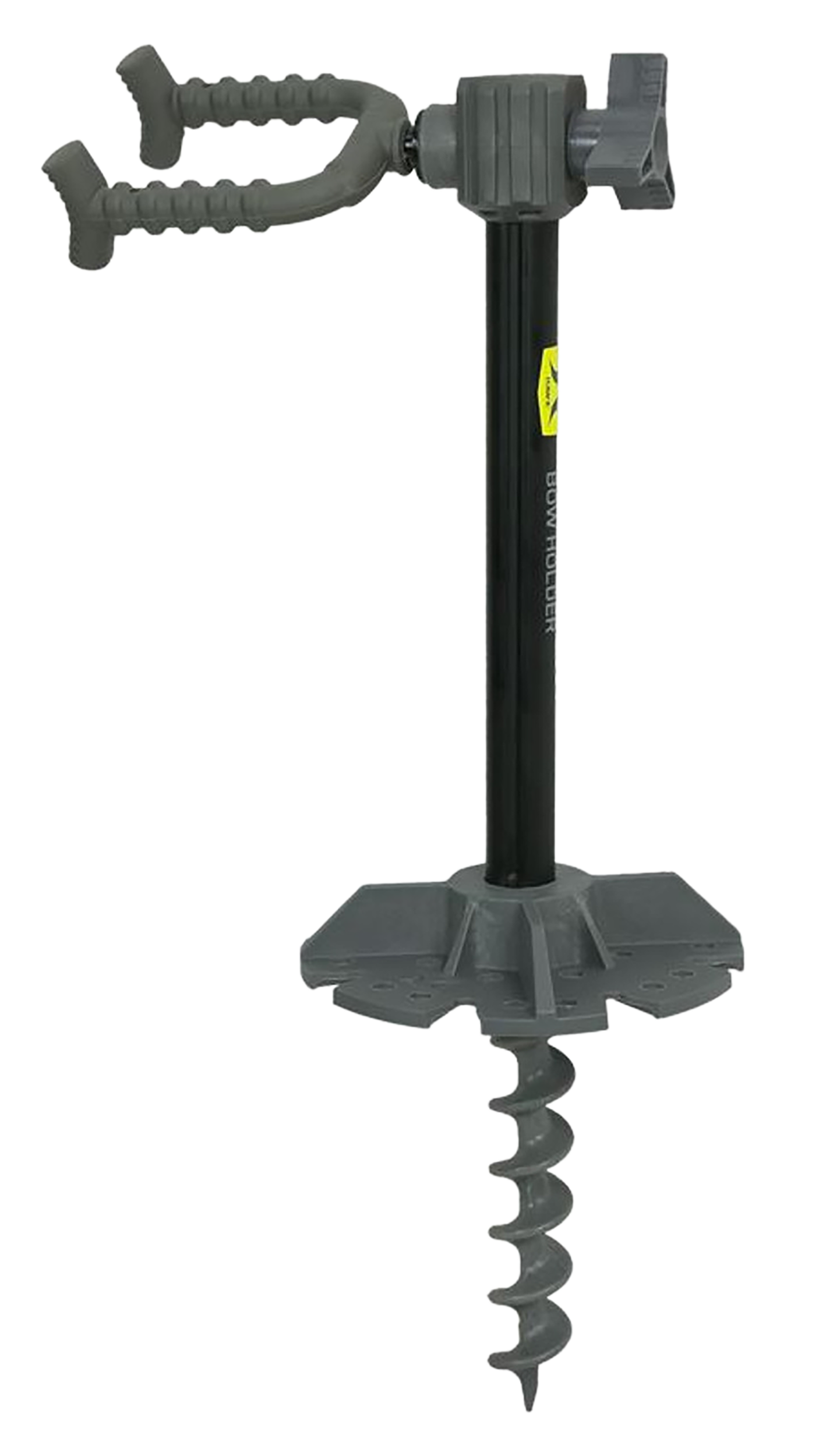 The portable earth anchor bow holder allows you to position your bow at your fingertips while you sit on the ground hands-free.It quickly digs into the ground with a 6" deep earth auger.Combined with a rugged ground plate, this bow holder is ultra stable & secure.The bow holder is designed to work with most bows and perfect for hunting from a ground blind or shooting in the backyard.A premium silent-grip limb fork adjusts 360 degrees and locks securely with geared teeth at the perfect angle for grabbing your bow when needed.