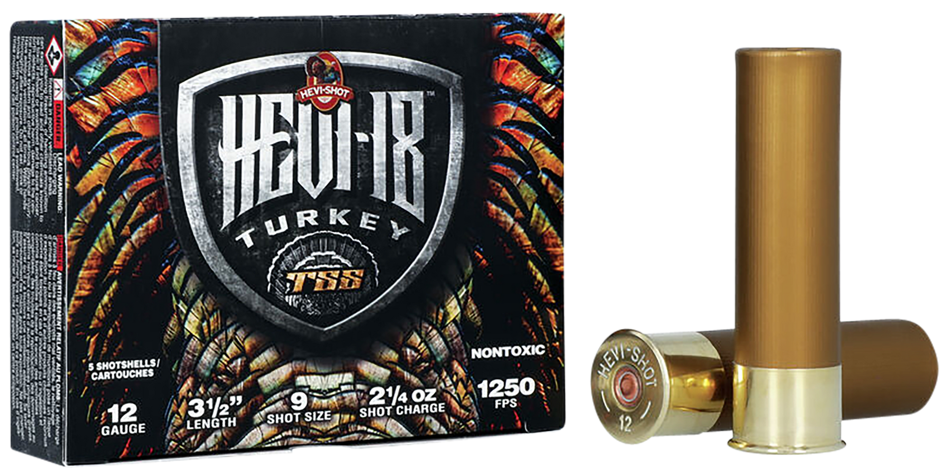 Hevi-shot goes ultra-dense with hevi-18 tss turkey.The 18 g/cc density pellets allow for smaller shot and higher pellet counts for the ultimate in long-range lethality.Incredibly tight patterns are achieve thanks to hevi-shot's unique, friction-free, sealed-in-the-shell spherical buffer.