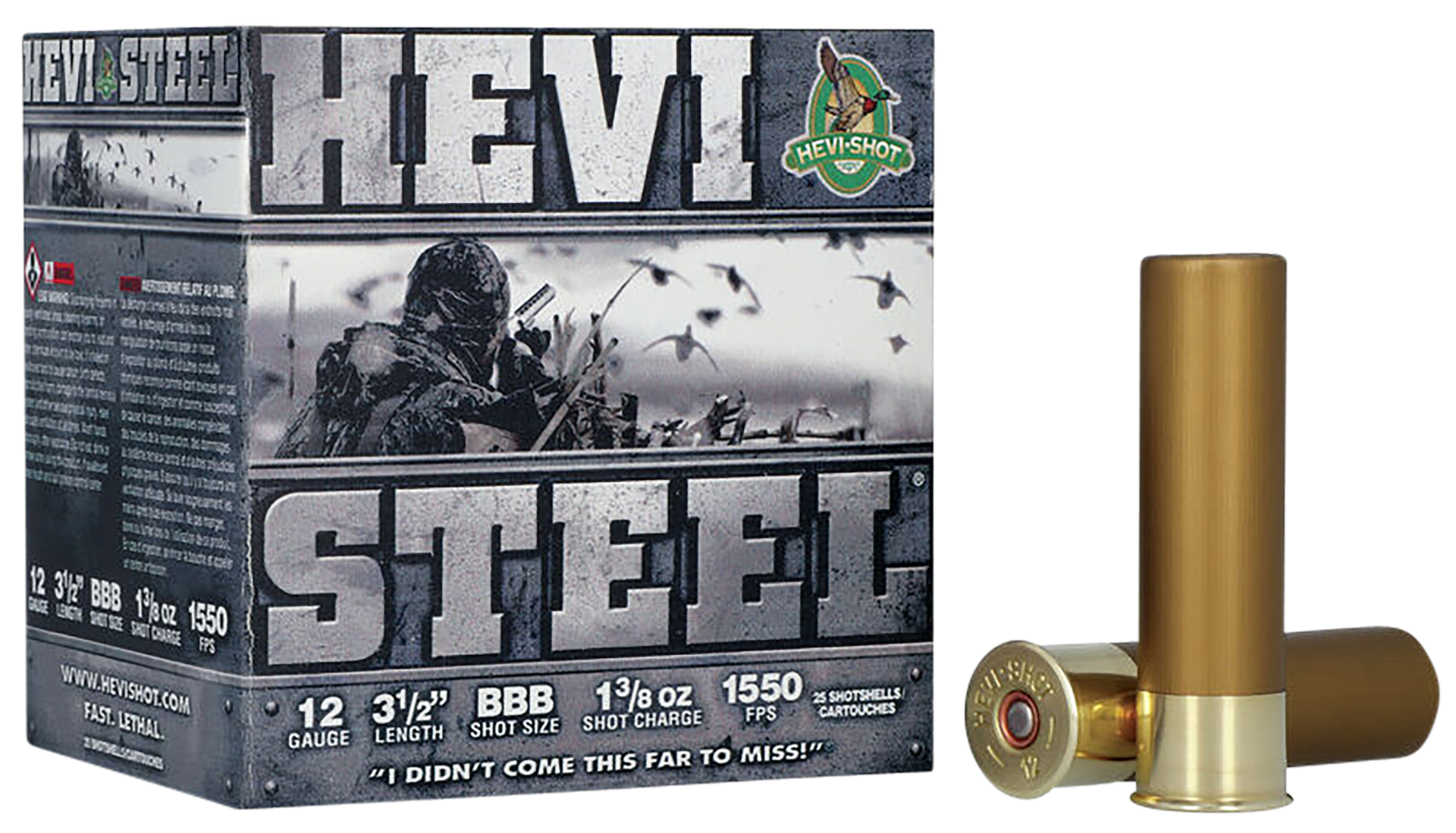 Hevi-shot's hevi-steel delivers major kinetic energy.It features an increase in speed that delivers 9% more energy at 30 yards and 8% at 40.More knockdown power and fewer crippled birds.Combining higher velocity, a best-in-class wad, and precision manufacturing techniques deliver the ultimate in performance.Application: HuntingGauge: 12 GaugeLength: 3.50"Ounces: 1 3/8 ozShot Size: BBBMuzzle Velocity: 1550 fpsRounds Per Box: 25Boxes Per Case: 10Hazair: YesView more
