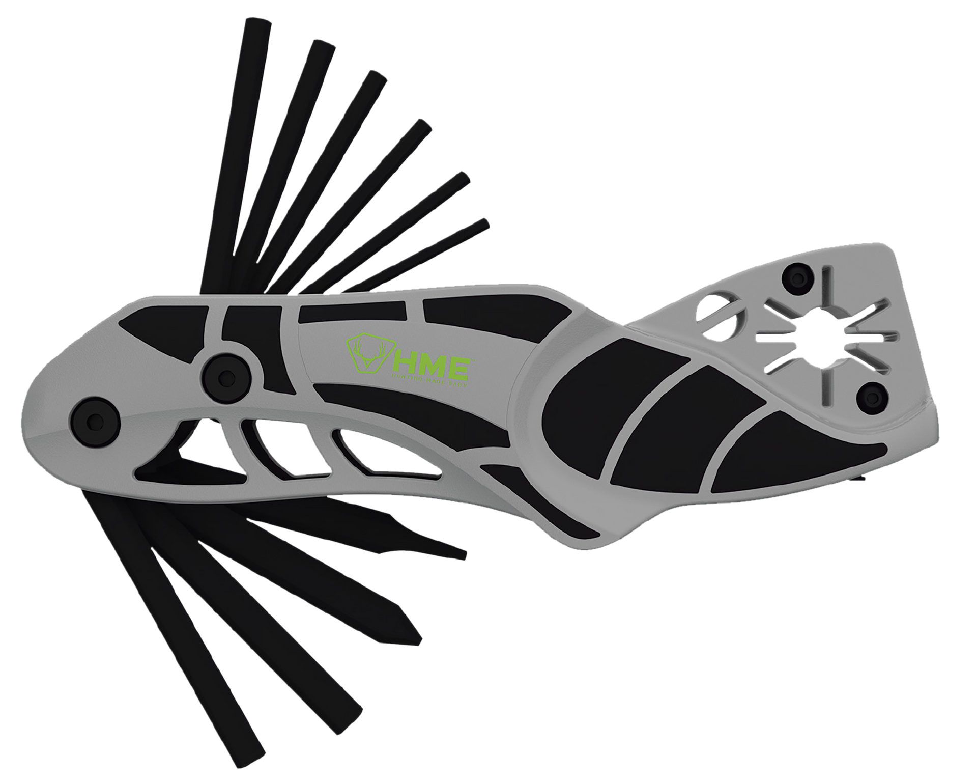 14-in-1 archery tool specifically designed for bows and arrows.The multi-tool features includes 8 allen wrench sizes, 2 screwdrivers, broadhead blade sharpener, broadhead wrench, nock wrench and a storage compartment.