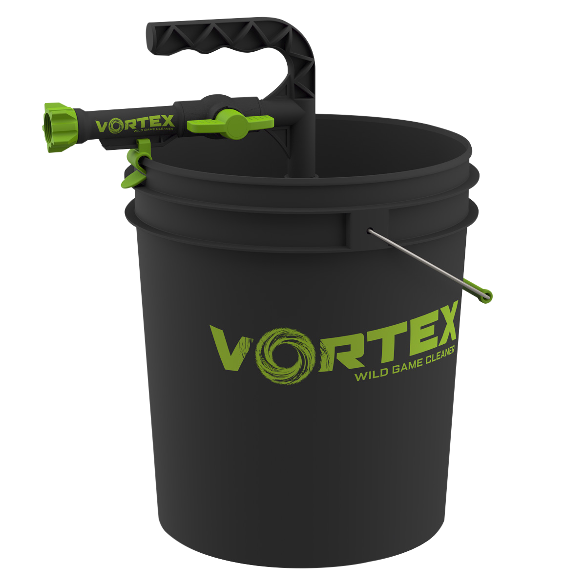 The wild game cleaner features a three piece portable design with a five (5) gallon bucket.It has an adjustable water flow valve, telescoping assembly that adjust for a variety of bucket sizes, and a sliding bucket clip.The game cleaner also has a detachable basket for easy insertion and removal of game.The cyclonic water motion effectively cleans game by removing feathers, blood, and other debris.It is made of a durable abs plastic.