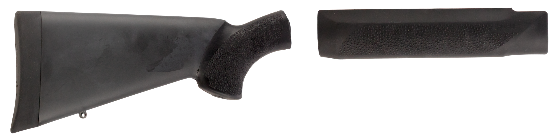 Hogue stocks come standard with aluminum pillar bedding.These pillars, inserted at critical action mounting bolt locations, guarantee an accurate, rock-solid action fit that will not shoot loose.The overmolded shotgun stocks are molded from a super tough fiberglass reinforced polymer, assuring stability and accuracy.The grip and entire forend are overmolded for outstanding handling characteristics.These superior stocks are durable, weatherproof and non-slip.Hogue shotgun stocks are super comfortable with a standard length of pull, ambidextrous ergonomic palm swell and a soft recoil cushioning buttpad.This combo kit features a stock and forend with a black finish.It is compatible with mossberg 500 12 gauge.