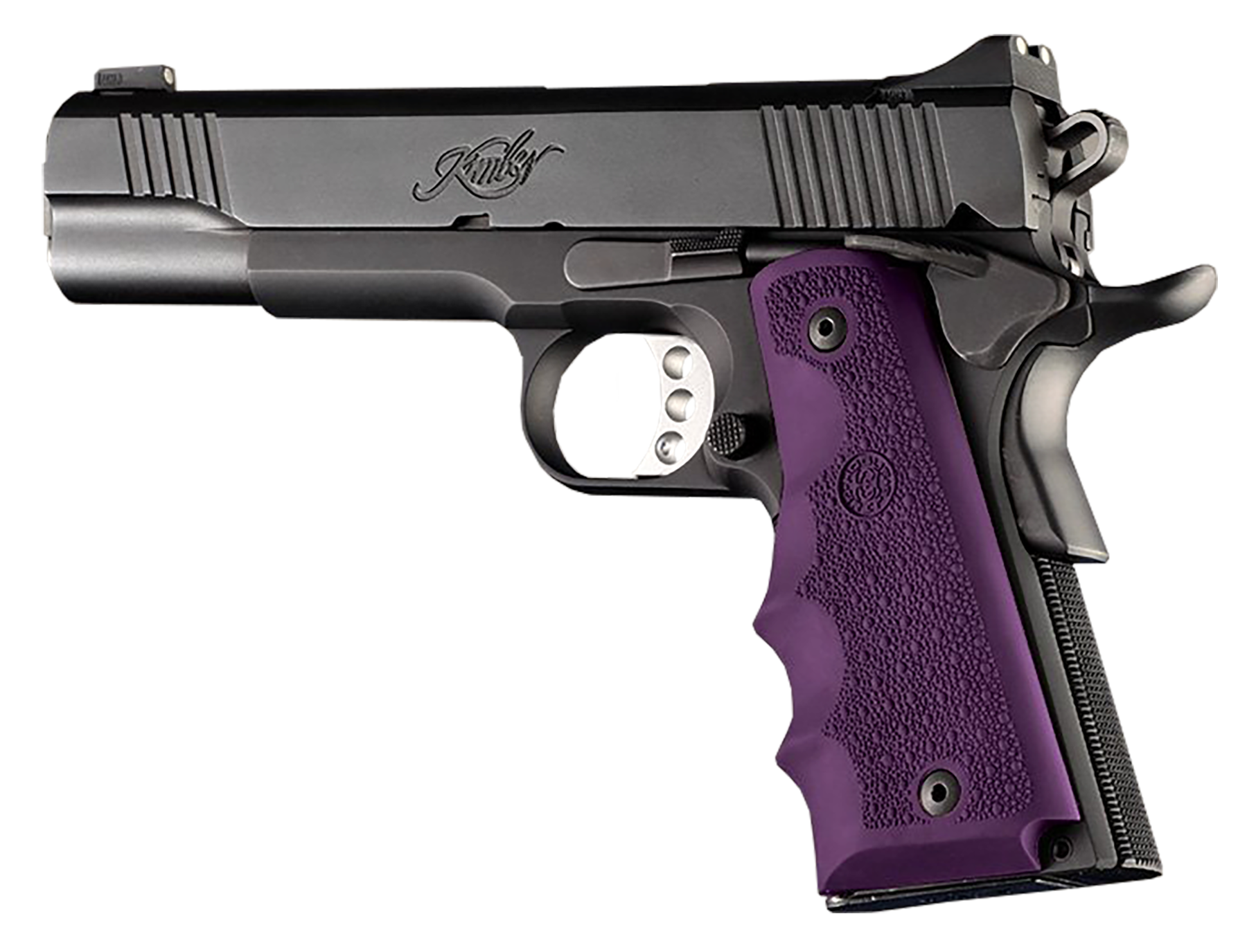Hogue rubber grips are molded from durable synthetic rubber that is not spongy or tacky, yet provides a soft recoil absorbing feel without affecting accuracy.The flexibility of the materials and molding process produces rubber grips with features that out perform all other makes.It is molded with a reinforcing insert directly engaging with the firearm frame for a rock-solid grip-to-frame fit.The cobblestone texture provides an efficient non-slip, non-irritating stippling pattern.This model has a purple finish and is compatible with 1911 government.