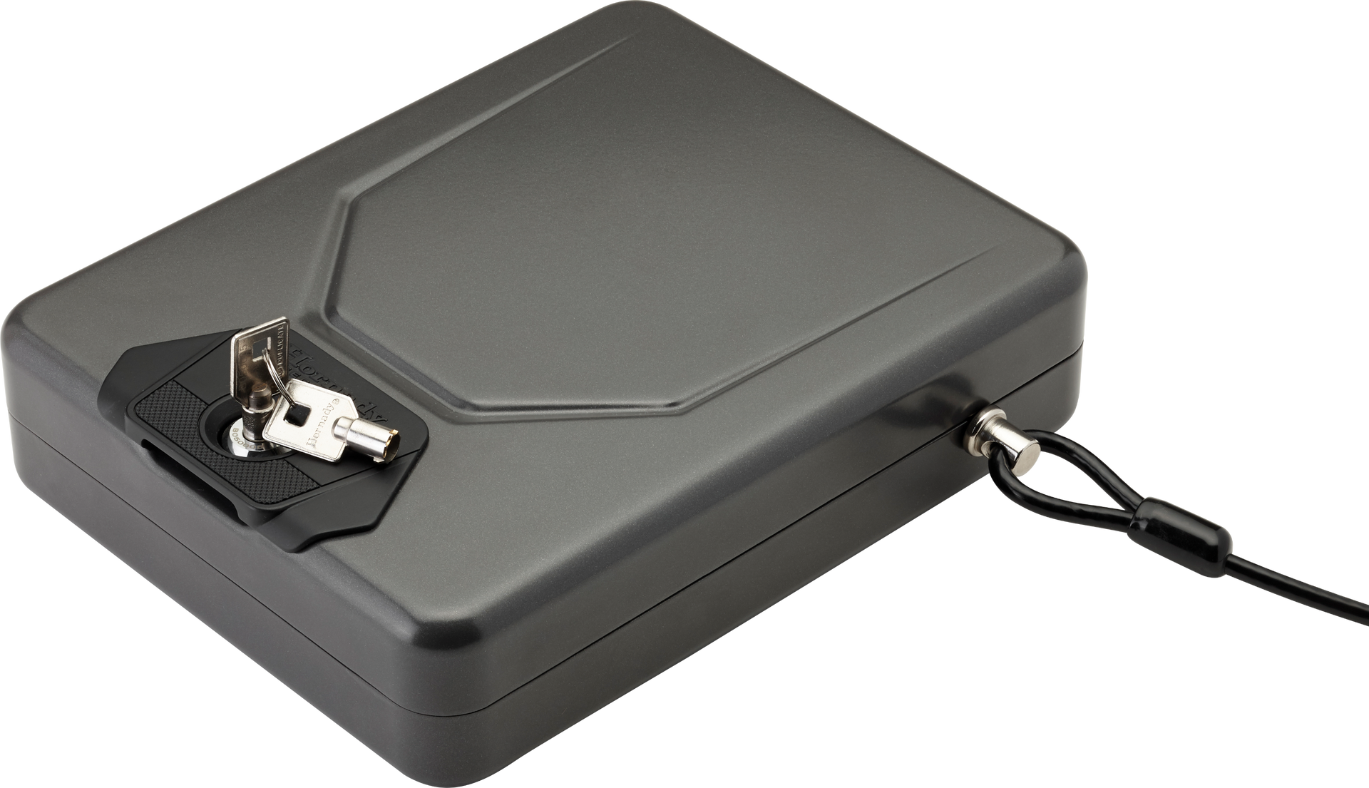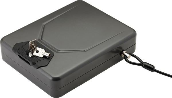 The alpha elite lock box fits 1911 size pistols and 4" revolvers.The safe features tamper proof construction, protective foam interior, certified child-resistant and meets tsa airline guidelines for firearms storage.Includes 3' security cable and two keys.