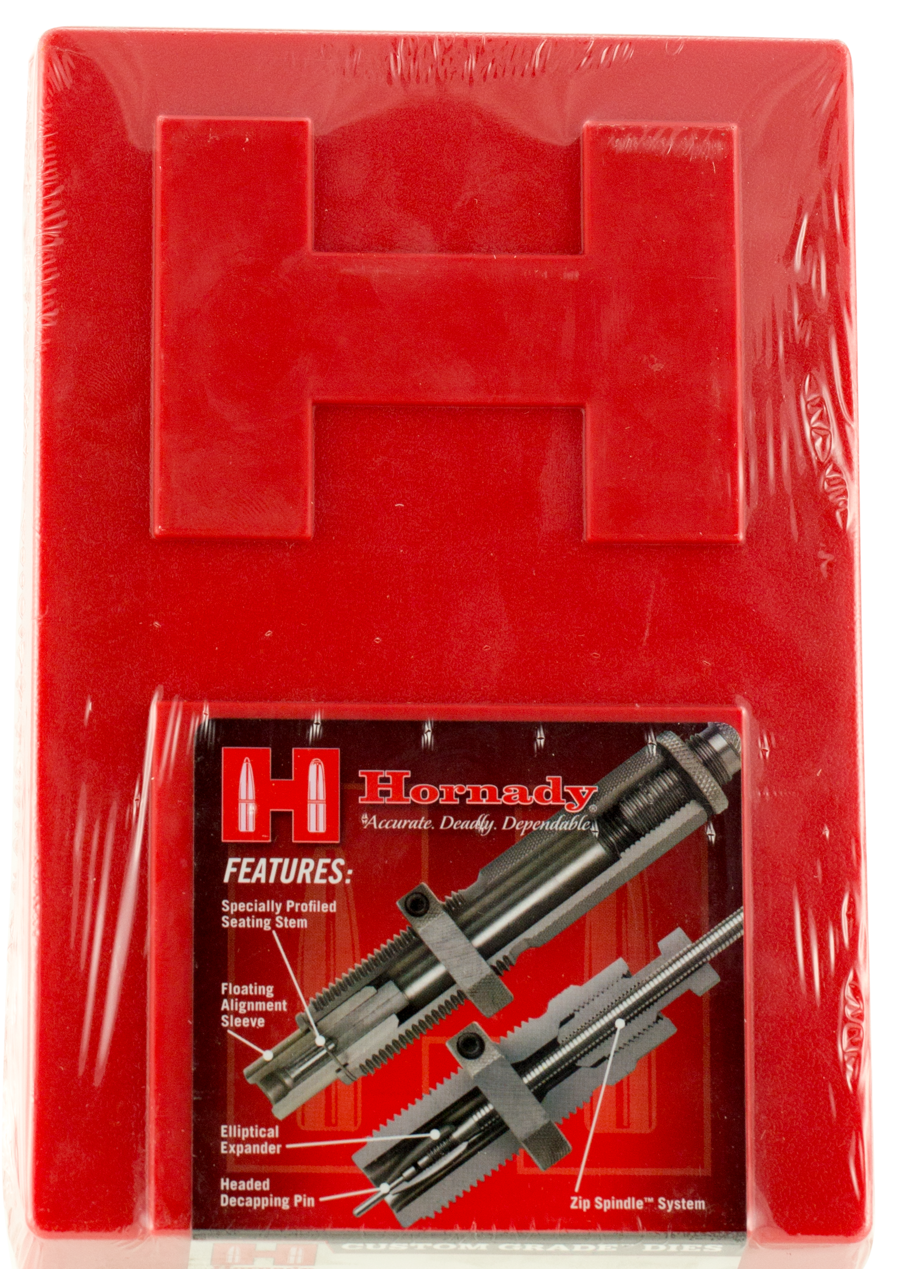 Hornady's custom-grade dies provide a lifetime of reloading.They are so well-crafted that they are guaranteed never to break or wear out from normal use.The sip spindle design features a series of light threads cut on the spindle and spindle collet.This design eliminates slippage and takes the knuckle-busting out of tightening the spindle lock while making spindle adjustments a snap.Series i features the popular bottleneck rifle cartridges.This two-die set includes a sizing die and bullet seater die.