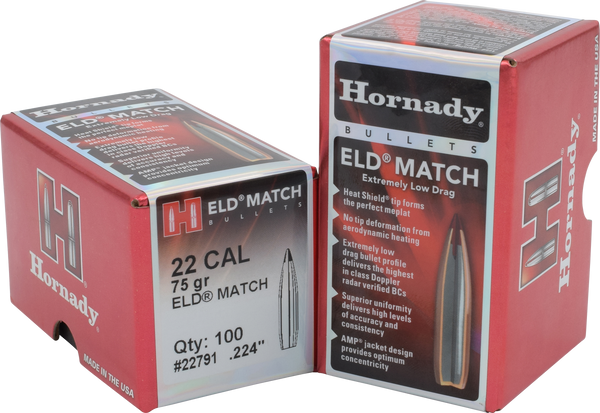 Hornady's eld match (extremely low drag match) bullets are technologically advanced, enhanced accuracy target bullets featuring heat shield tips with the ideal meplat (tip point) combined with numerous design features that deliver the highest-in-class ballistic coefficients, superior accuracy and extreme consistency from bullet to bullet, lot to lot.An optimum secant ogive and boattail design along with the heat shield tip produce a bullet with the highest possible ballistic coefficient in its class.The tip is immune to the effects of aerodynamic heating and retains its shape to provide a perfect meplat (tip) that is always the same shape.