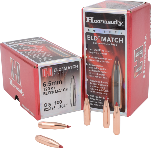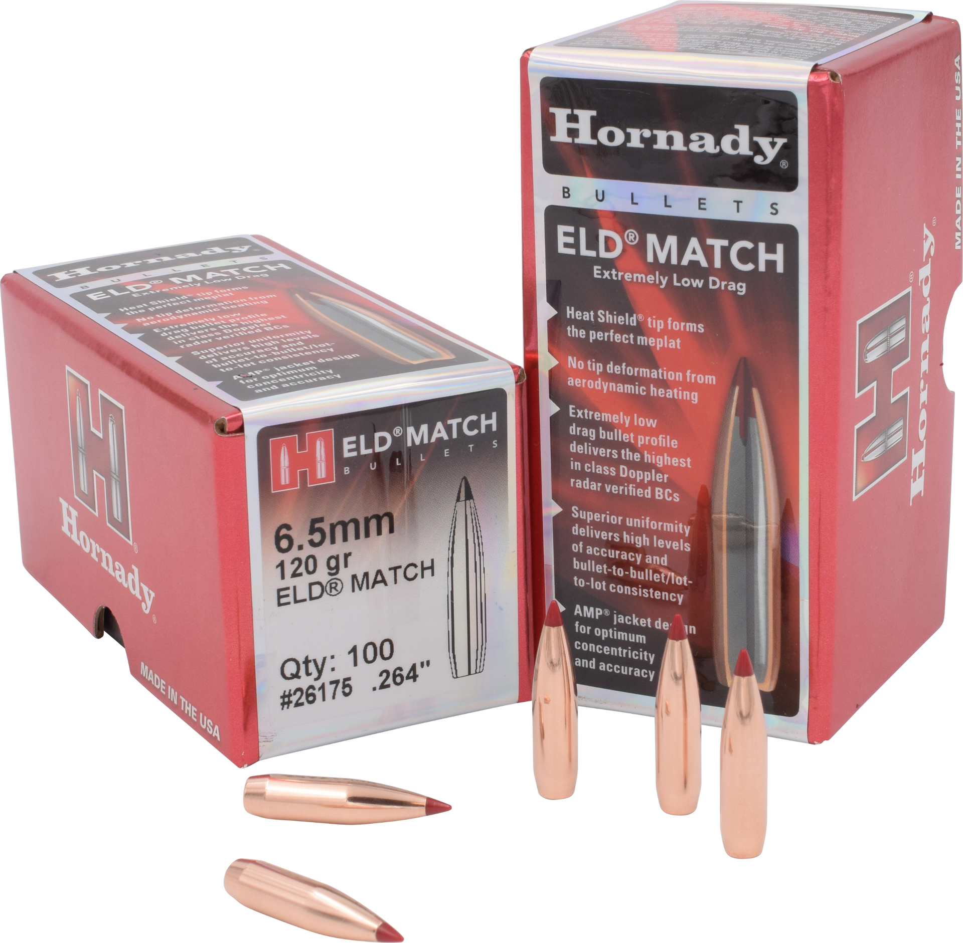 Hornady's eld match (extremely low drag match) bullets are technologically advanced, enhanced accuracy target bullets featuring heat shield tips with the ideal meplat (tip point) combined with numerous design features that deliver the highest-in-class ballistic coefficients, superior accuracy and extreme consistency from bullet to bullet, lot to lot.An optimum secant ogive and boattail design along with the heat shield tip produce a bullet with the highest possible ballistic coefficient in its class.The tip is immune to the effects of aerodynamic heating and retains its shape to provide a perfect meplat (tip) that is always the same shape.