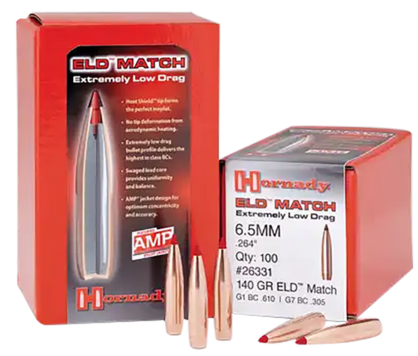 Hornady's eld match (extremely low drag match) bullets are technologically advanced, enhanced accuracy target bullets featuring heat shield tips with the ideal meplat (tip point) combined with numerous design features that deliver the highest-in-class ballistic coefficients, superior accuracy and extreme consistency from bullet to bullet, lot to lot.An optimum secant ogive and boattail design along with the heat shield tip produce a bullet with the highest possible ballistic coefficient in its class.The tip is immune to the effects of aerodynamic heating and retains its shape to provide a perfect meplat (tip) that is always the same shape.