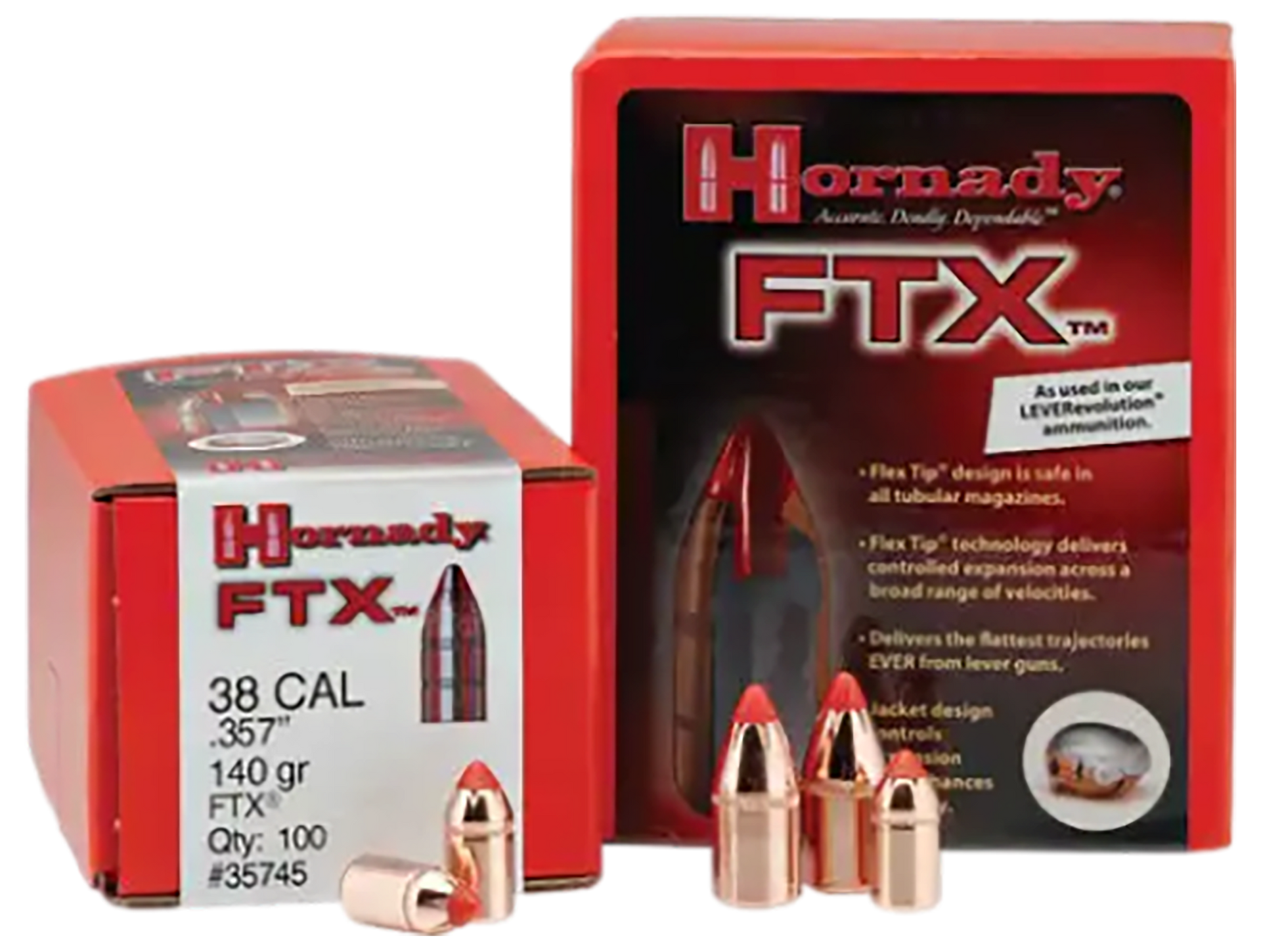 Hornady's ftx rifle bullets revolutionized lever gun ballistics, creating a level of performance for these popular firearms.The patented flex tip, combined with its secant ogive design, creates an aerodynamic bullet with a thinner, tapered front section and extended bearing surface for much higher ballistic coefficients.The high antimony lead core is locked to the jacket with an interlock ring, resulting in reliable performance and deep penetration on large or heavy-bodied game animals.