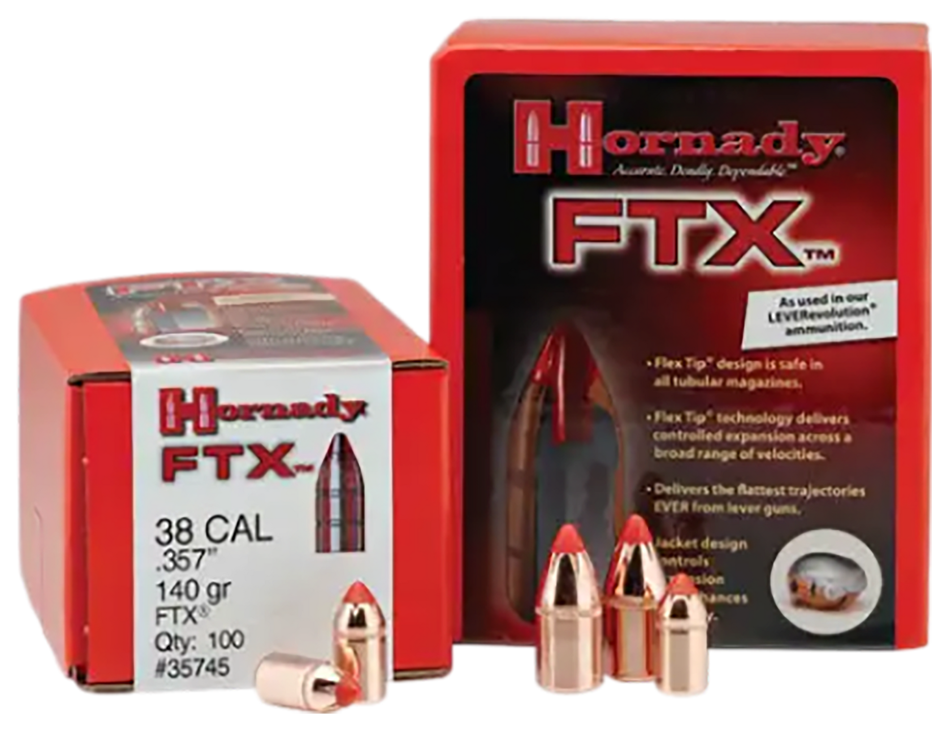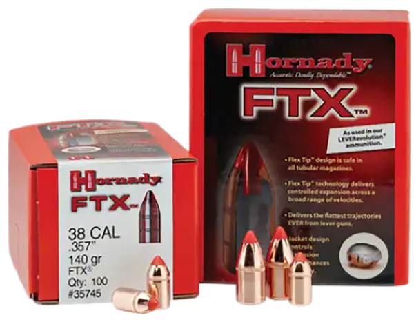Hornady's ftx handgun bullets achieve reliable expansion over a wide range of velocities.Upon impact, the patented ftx tip is compressed into the front of the bullet, causing the bullet to expand and transfer immediate energy for a devastating temporary cavity, even at low velocity.It utilizes an interlock ring which mechanically locks the core and jacket together for maximum weight retention and deep penetration.The secant ogive profile delivers stability, flat trajectories and amazing accuracy, while the heavy jacket over the shank of the bullet is combined with hornady's proven interlock design.