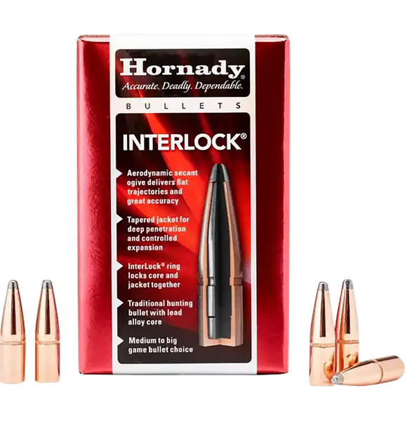 Hornady's interlock bullet features a raised ring inside the jacket that is embedded in the bullet's core that keeps the core and jacket locked together during expansion to retain mass and energy.The tapered jacket thickness is precisely controlled for expansion at all velocities, while its one-piece core does not separate.The cannelure provides accurate and consistent crimping and also works with the interlock ring to ensure the core and jacket remain locked during expansion.