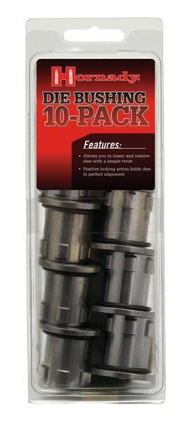 Maximize your reloading time with the lock-n-load quick change bushing system.The lock-n-load reloading system is a patented quick change bushing system that lets you change dies with a simple flick of the wrist.With lock-n-load technology in your reloading press, you can stop loading, change dies and start loading another caliber in seconds.This pack contains ten hornady lock-n-load die bushings.