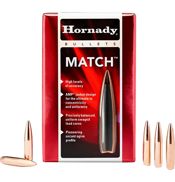 Hornady's match bullets features the revolutionary amp (advanced manufacturing process) bullet jacket.The bullet jackets are a technological advancement in design, tooling, and manufacturing that combine to produce the most consistently concentric bullet jackets available.Coupled with precision swaged cores and manufactured to the tightest standards in the industry, hornady match provides consistency, high ballistic coefficients and unprecedented levels of accuracy.Its geometric profile works to produce low drag and flatter trajectories, while the secant ogive design also provides optimum bearing surface for stability in flight and the best ballistic coefficient possible.The angle and length of the boat tail is unique and optimized for each caliber and weight of match bullet to maximize ballistic coefficient and performance.