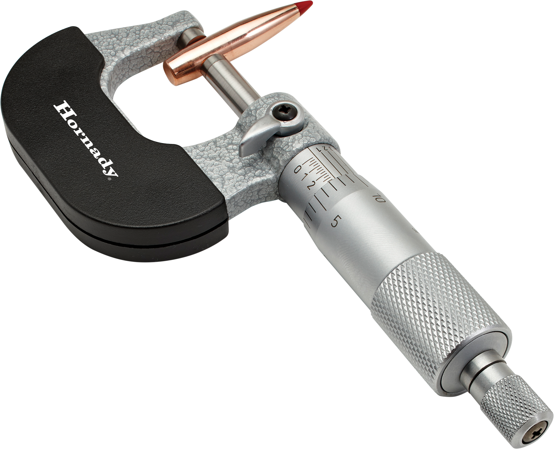 The hornady micrometer instrument accurately measures minute distances for precise readings on bullets or objects up to 1 inch in size.