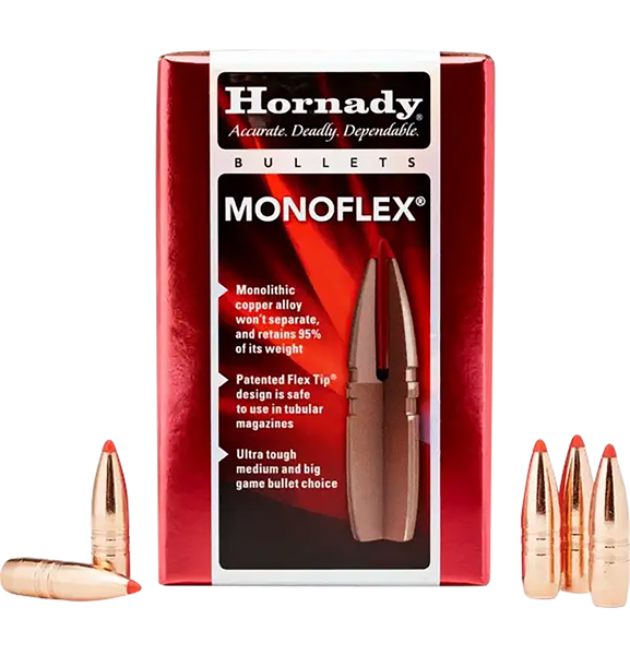 Hornady's monoflex bullet combines the technologies of the gmx and ftx bullet designs and gives lever gun shooters another option.Constructed of a copper alloy, the monoflex offers hunters a solid bullet that won't separate, and when recovered, retains 95% of its original weight.Upon impact, the patented flex tip design initiates immediate expansion, even at the lower velocities often encountered in mid to long range lever gun shooting situations.Its secant ogive profile delivers the flattest possible trajectories from lever guns.