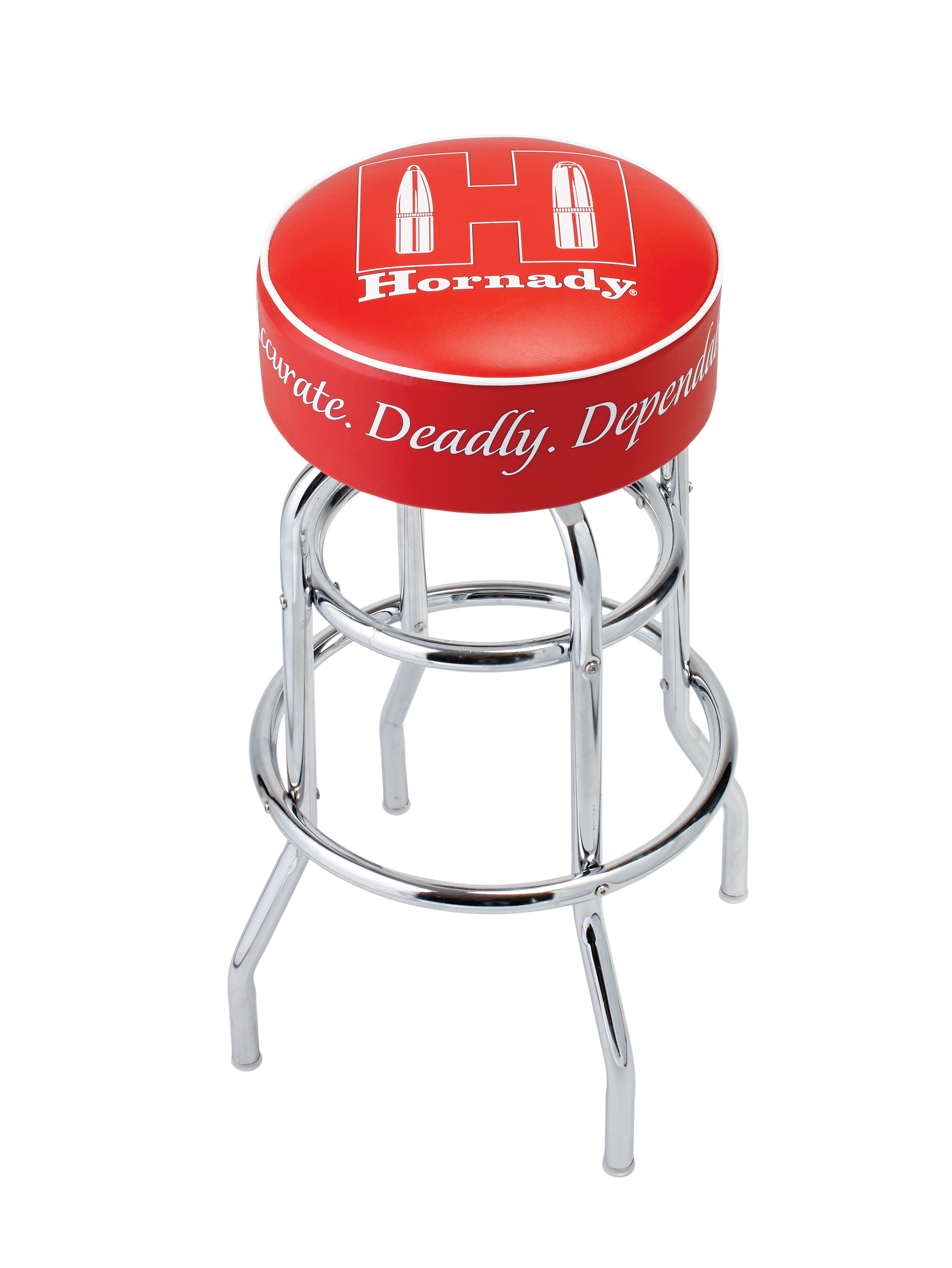 <p>providing a comfortable and stylish seat in your reloading room, garage or bar.This custom designed stool features a hornady logo on the seat and is made of durable marine grade vinyl, thick foam padding and chrome double rung reinforced legs.</p>Color: Chrome/RedMaterial: Chromed Steel/ VinylDimensions: 20" X 20" X 31"View more
