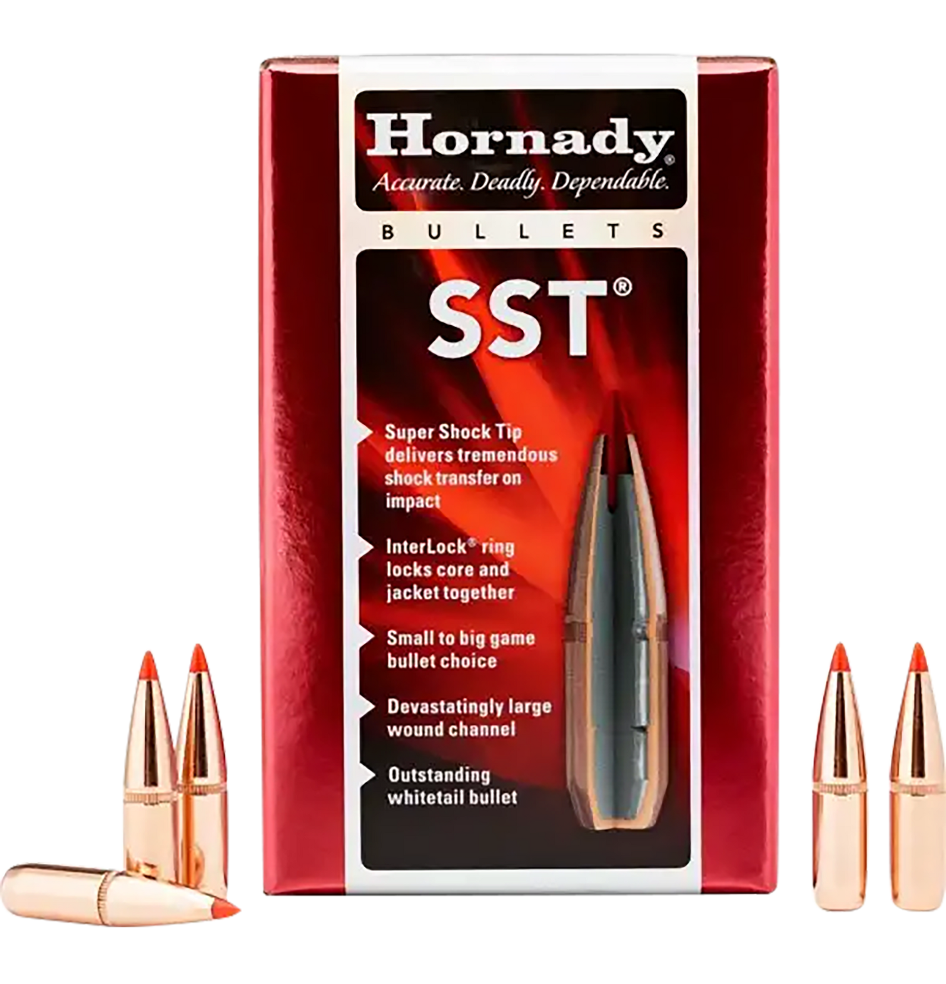 Short for "super shock tip," the hornady sst is designed to deliver tremendous shock on impact while expanding quickly and reliably, particularly at higher velocities.Flat shooting and deadly accurate, it's an ideal bullet for whitetails, as well as most north american game animals from antelope to moose and similar-sized african plains game.The sleek polymer tip increases the ballistic coefficient, while the secant ogive boat-tail profile gives hunters the speed, ballistic efficiency and downrange energy they're looking for.It utilizes an interlock ring which ensures the core and jacket remain locked solid during expansion.