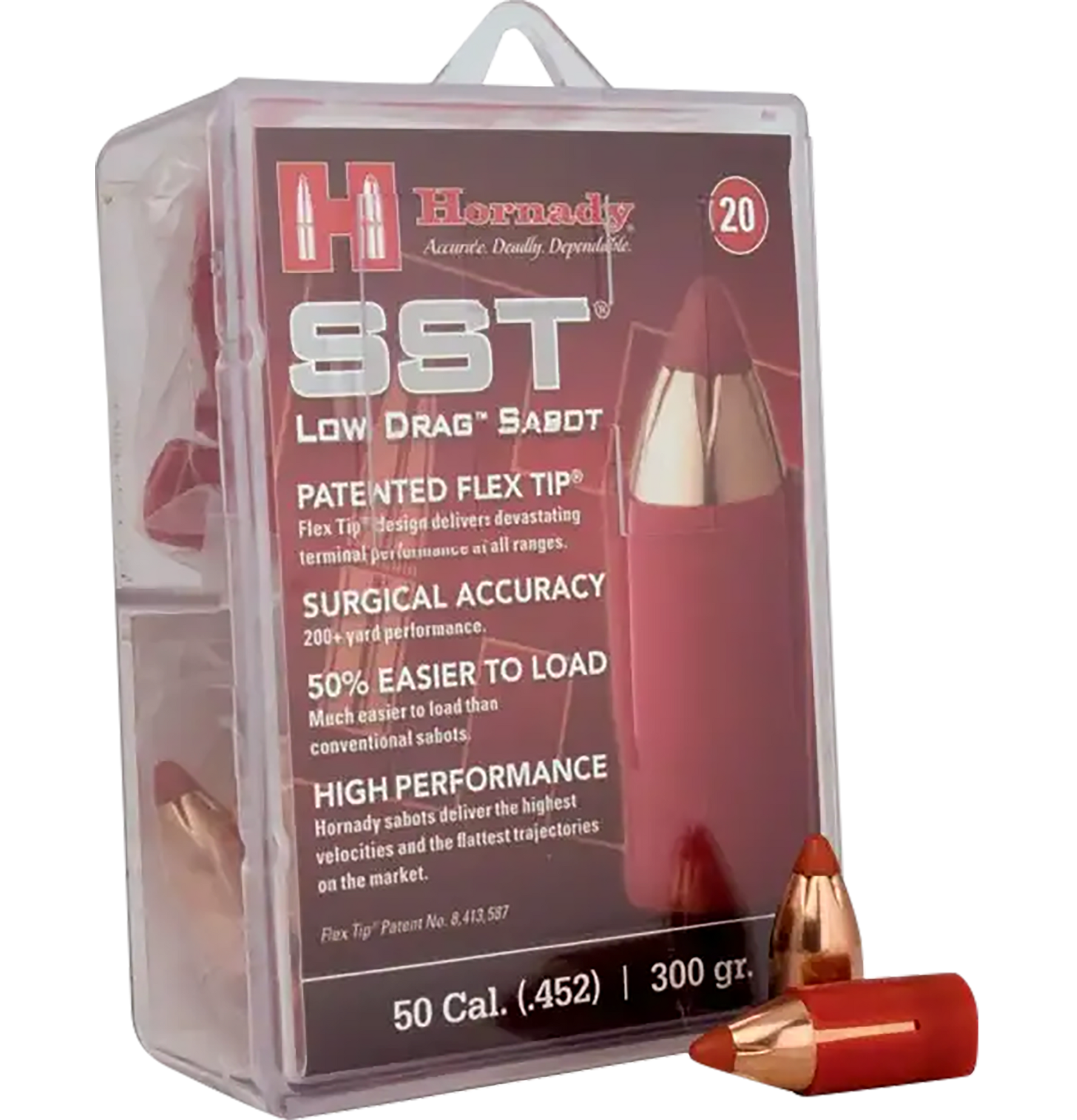 The sst-ml is a phenomenal muzzleloading option and an excellent choice for long range blackpowder hunters.Hornady's sabots fully engage the rifling to keep the sst-ml centered and sealed during firing, allowing for maximum velocity and unparalleled long range performance.Upon impact, the flex tip is compressed into the front of the bullet, causing the bullet to expand.The speed sabot features a fumble-free method of pre-loading pellets.