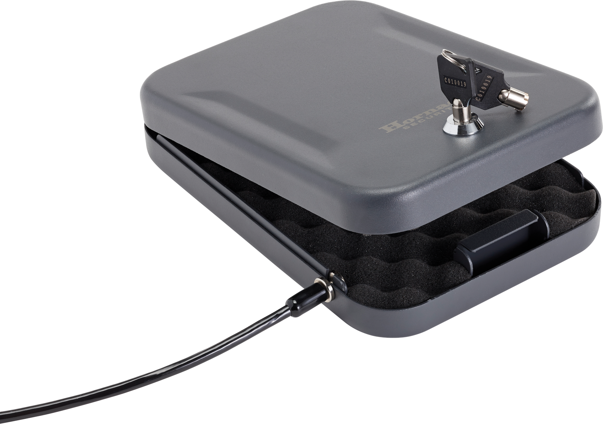 Hornady security lock box provide secure storage for handguns and other valuables at home, on a nightstand, in the car or when traveling.Fits most 4" barrel pistols and some 4" revolvers.Includes a 4' steel security cable that secures to any stationary object including a vehicle seat or heavy piece of furniture.Comes with two keys.Type: Personal VaultColor: BlackDimensions: 9.5" x 6.5" x 1.75"Entry: KeyMaterial: SteelFinish: BlackInterior:...View more