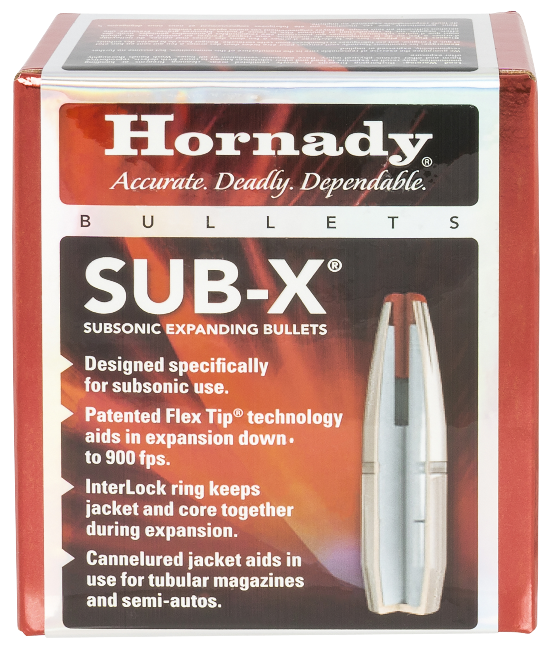Sub-x (subsonic expanding) bullets deliver big results without a big bang.Designed to provide deep penetration below the speed of sound, sub-x features a lead core.Long grooves in its gilding metal jacket combine with its flat profile and the patented flex tip insert within the bullets hollow point cavity to help it expand reliably at low velocities.Cannelures provide positive case crimp, making sub-x ideal for semiautomatic weapons.